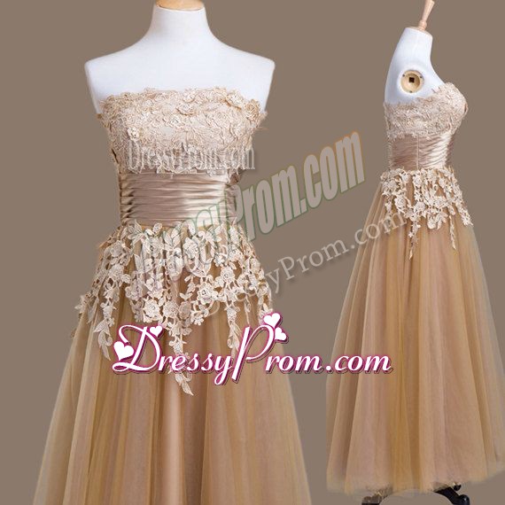 Neckline : StraplessShown Color : BrownSilhouette : EmpireSleeve Length : sleevelessHemline : tea lengthBack Detail : Lace upFabric : TulleEmbellishment : AppliquesOccasion : Prom,Party,Wedding PartySeason : Spring,Summer,Fall,Winter