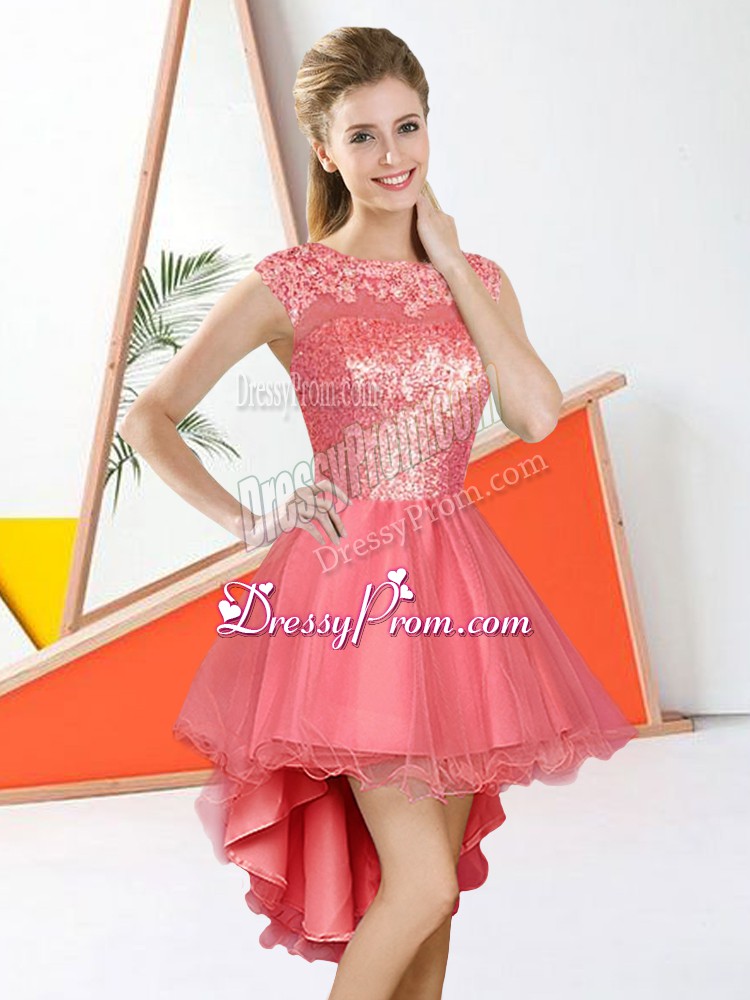Neckline : BateauShown Color : Watermelon RedSilhouette : A-lineSleeve Length : sleevelessHemline : high lowBack Detail : BacklessFabric : OrganzaEmbellishment : Beading,LaceOccasion : Prom,PartySeason : Spring,Summer,Fall