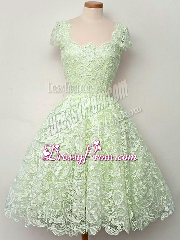 Neckline : StrapsShown Color : Yellow GreenSilhouette : A-lineSleeve Length : cap sleevesHemline : knee lengthBack Detail : Lace upFabric : LaceEmbellishment : LaceOccasion : Prom,Party,Wedding PartySeason : Spring,Summer,Fall