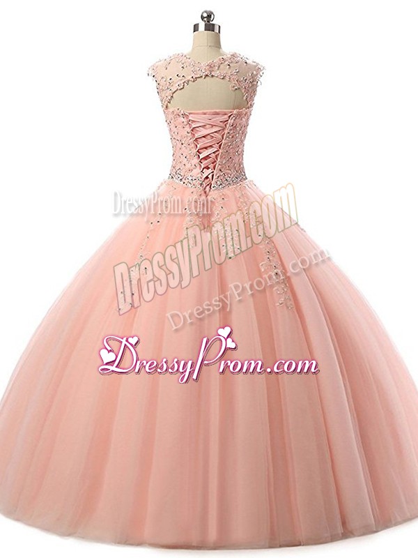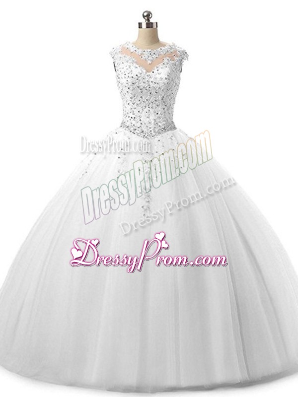 Neckline : ScoopShown Color : WhiteSilhouette : Ball GownsSleeve Length : sleevelessHemline : floor lengthBack Detail : Lace upFabric : TulleEmbellishment : Beading,LaceOccasion : Military Ball,Sweet 16,QuinceaneraSeason : Spring,Summer,Fall,Winter