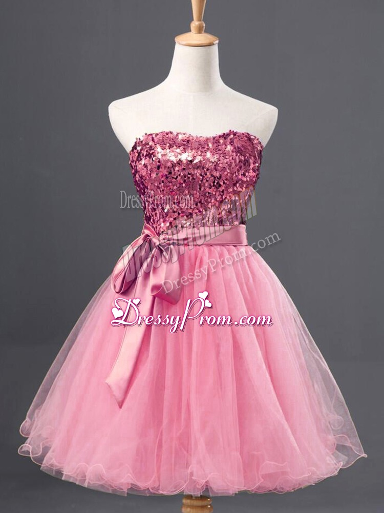 Neckline : SweetheartShown Color : Rose Pink Silhouette : A-lineSleeve Length : sleevelessHemline : mini lengthBack Detail : ZipperFabric : TulleEmbellishment : SequinsOccasion : Prom,PartySeason : Spring,Summer,Fall