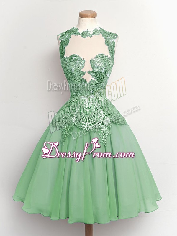 Neckline : High-neckShown Color : Apple GreenSilhouette : A-lineSleeve Length : sleevelessHemline : knee lengthBack Detail : Lace upFabric : ChiffonEmbellishment : LaceOccasion : Prom,Party,Wedding PartySeason : Spring,Summer,Fall