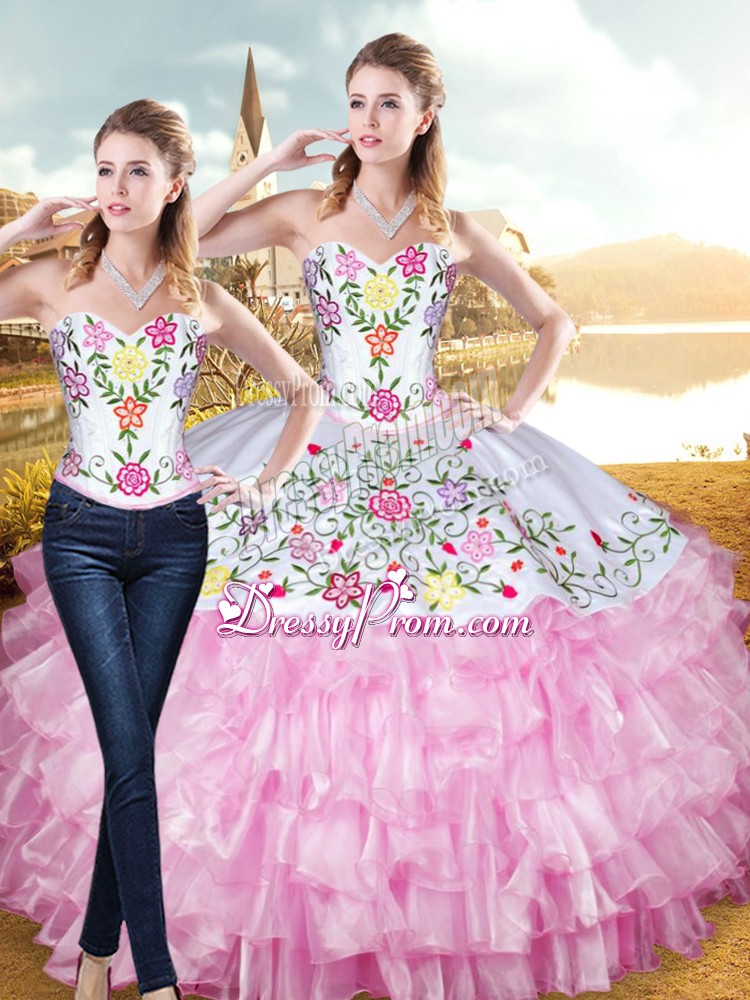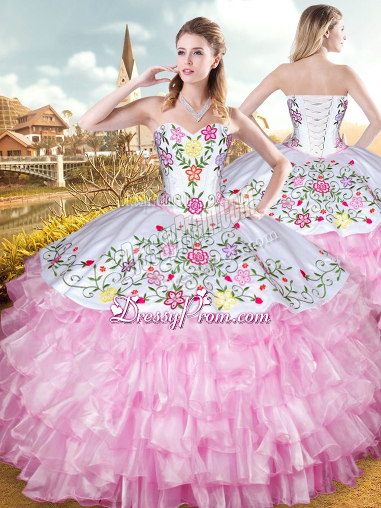Neckline : SweetheartShown Color : Rose Pink Silhouette : Two PiecesSleeve Length : sleevelessHemline : floor lengthBack Detail : Lace upFabric : Organza,TaffetaEmbellishment : Embroidery,Ruffled LayersOccasion : Military Ball,Sweet 16,QuinceaneraSeason : Spring,Summer,Fall,Winter
