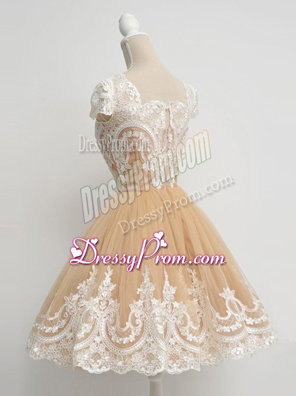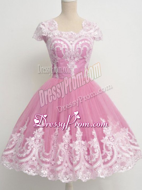 Neckline : SquareShown Color : Rose Pink Silhouette : A-lineSleeve Length : cap sleevesHemline : knee lengthBack Detail : ZipperFabric : TulleEmbellishment : LaceOccasion : Prom,Party,Wedding PartySeason : Spring,Summer,Fall