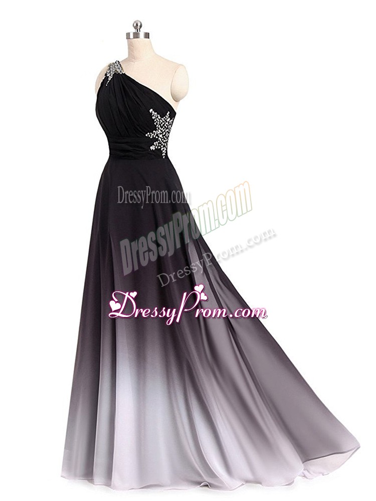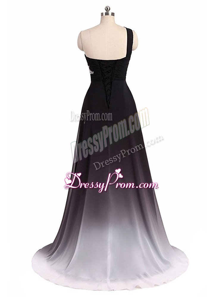 Neckline : One shoulderShown Color : Multi-colorSilhouette : EmpireSleeve Length : sleevelessBack Detail : Lace upFabric : ChiffonEmbellishment : Beading,RuchingOccasion : Prom,Sweet 16,QuinceaneraSeason : Spring,Summer,Fall,Winter