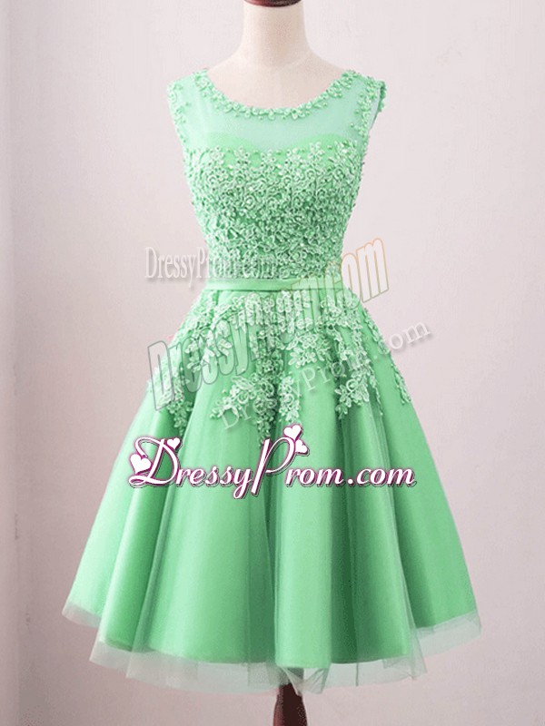 Neckline : ScoopShown Color : GreenSilhouette : A-lineSleeve Length : sleevelessHemline : knee lengthBack Detail : Lace upFabric : TulleEmbellishment : LaceOccasion : Prom,Party,Wedding PartySeason : Spring,Summer,Fall