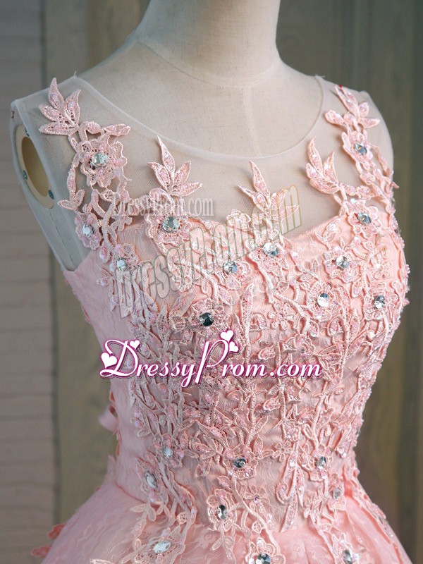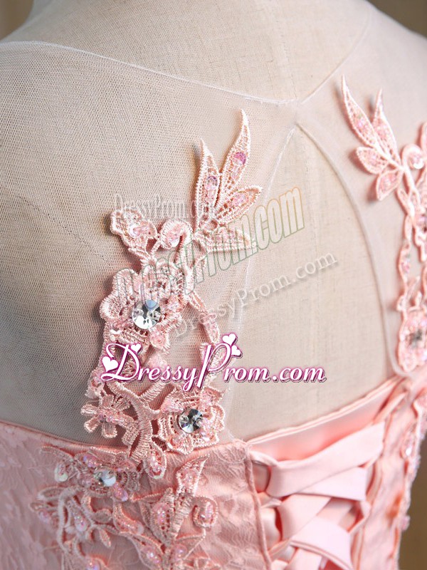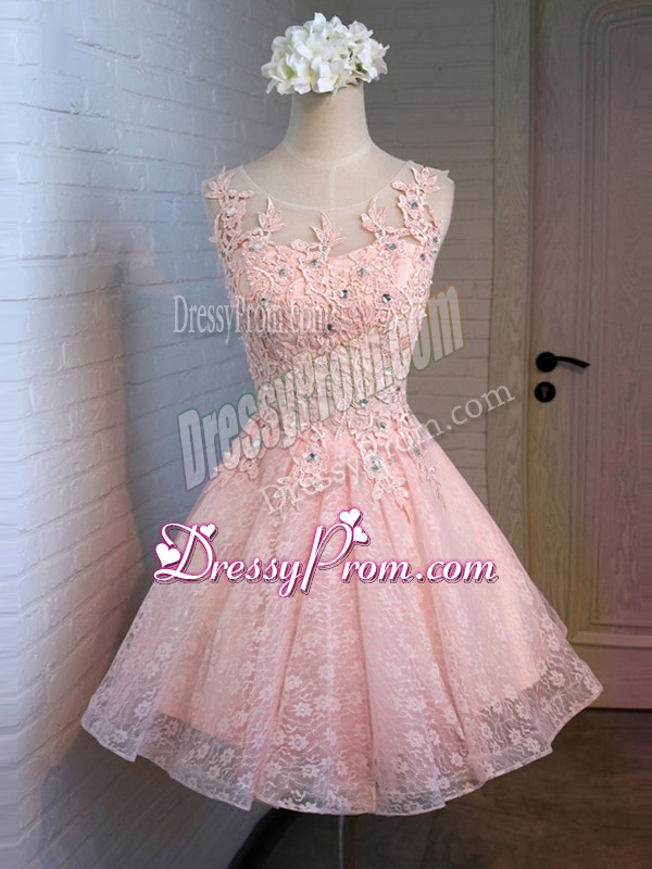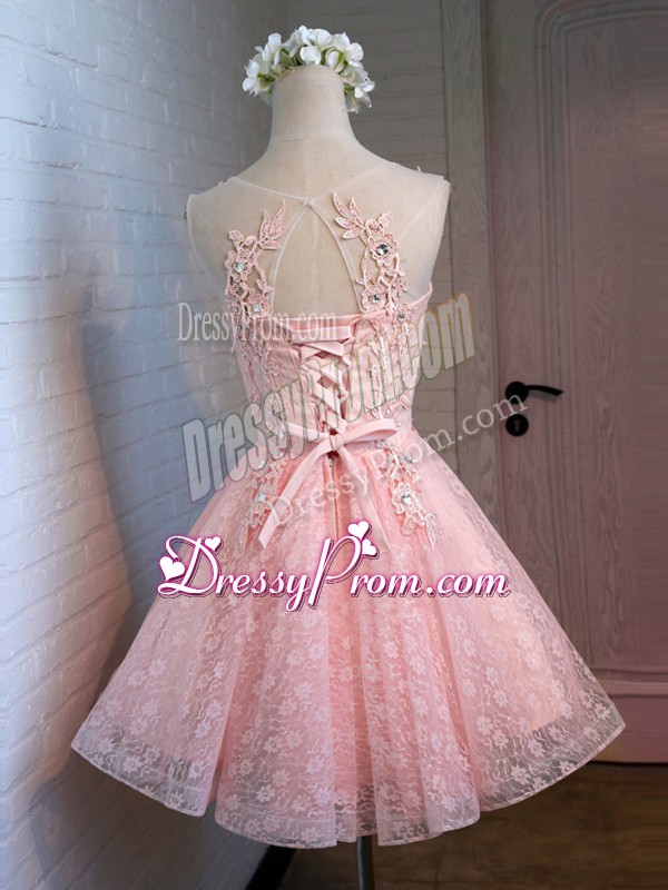 Neckline : ScoopShown Color : Pink Silhouette : A-lineSleeve Length : sleevelessHemline : mini lengthBack Detail : Lace upFabric : LaceEmbellishment : Lace,AppliquesOccasion : Prom,Party,Sweet 16Season : Spring,Summer,Fall