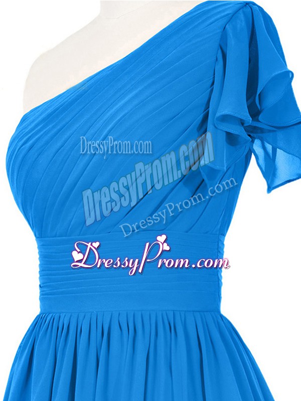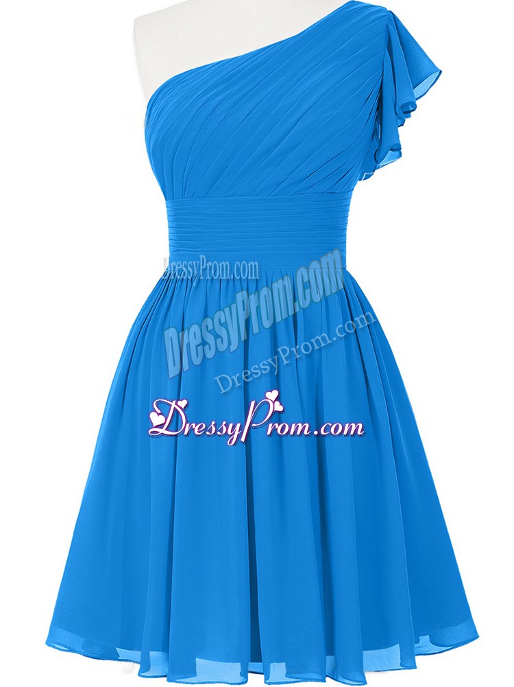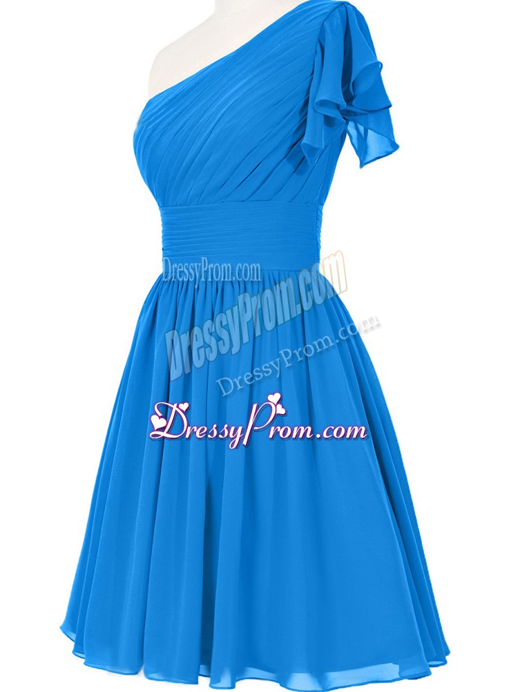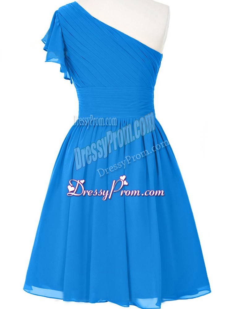 Neckline : One shoulderShown Color : BlueSilhouette : EmpireSleeve Length : sleevelessHemline : mini lengthBack Detail : Side zipperFabric : ChiffonEmbellishment : RuchingOccasion : Prom,Party,Sweet 16Season : Spring,Summer,Fall