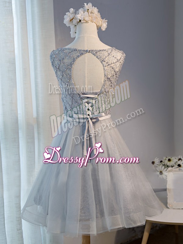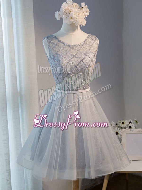 Neckline : ScoopShown Color : GreySilhouette : A-lineSleeve Length : sleevelessHemline : mini lengthBack Detail : Lace upFabric : TulleEmbellishment : BeadingOccasion : Prom,Party,Sweet 16Season : Spring,Summer,Fall