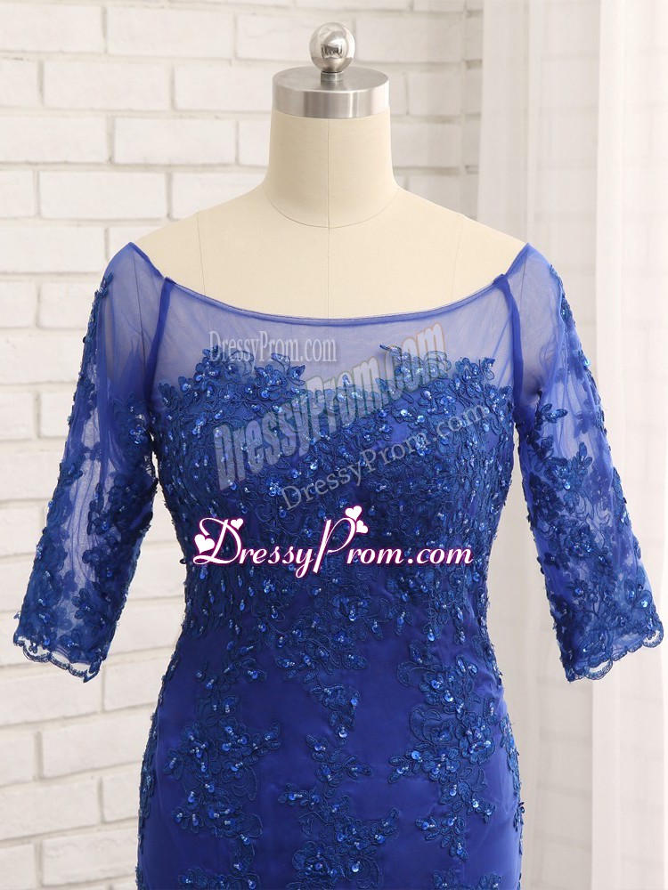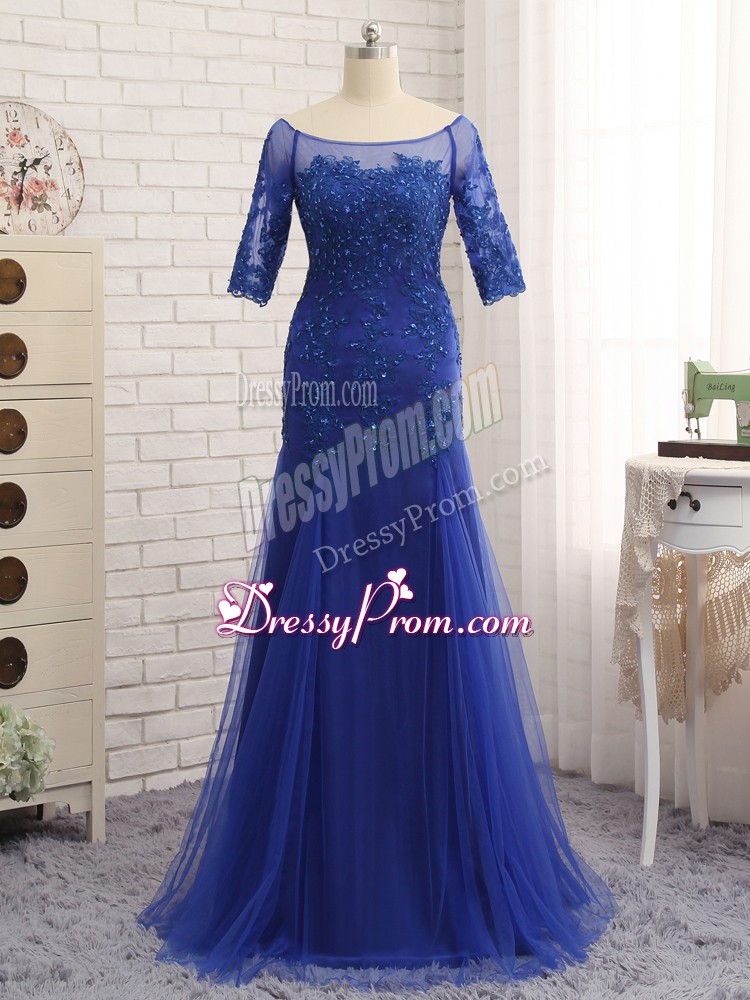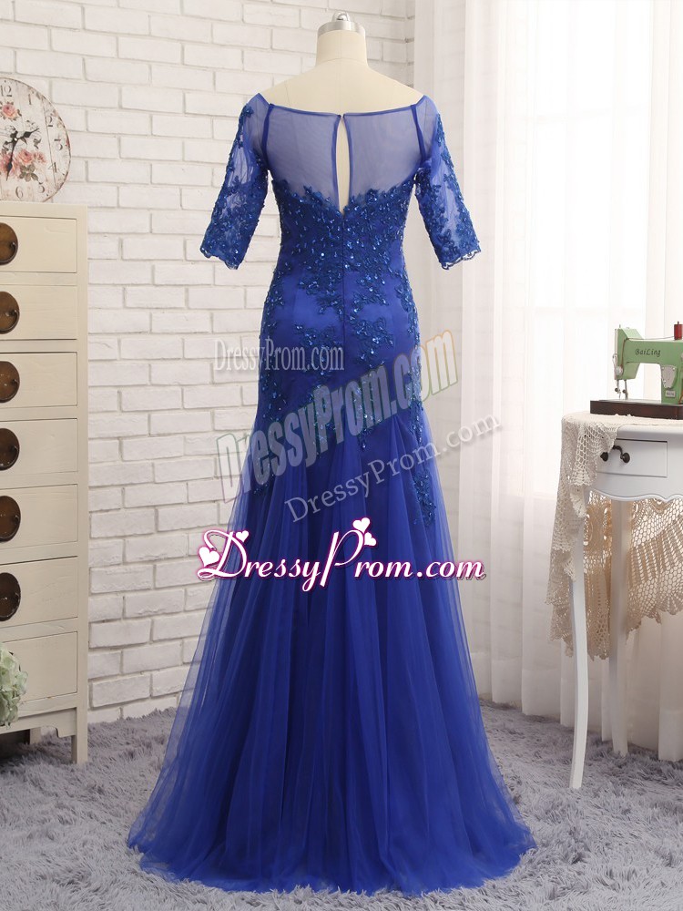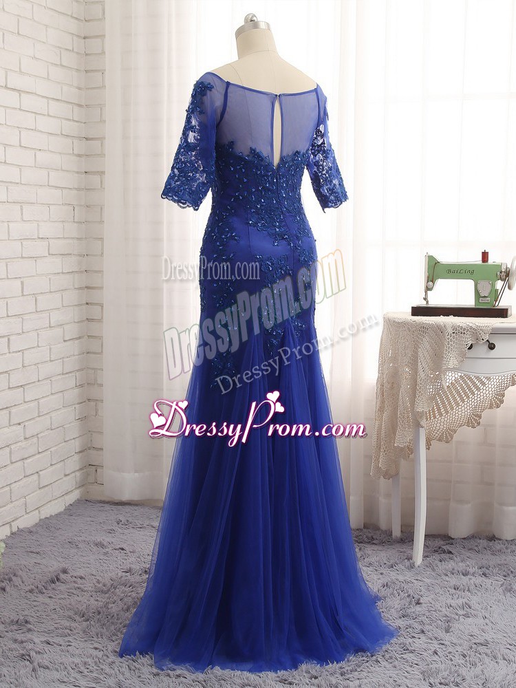 Neckline : ScoopShown Color : Royal BlueSilhouette : Column/SheathSleeve Length : half sleevesBack Detail : ZipperFabric : TulleEmbellishment : Lace,AppliquesOccasion : Prom,Military Ball,BeachSeason : Spring,Summer,Fall,Winter