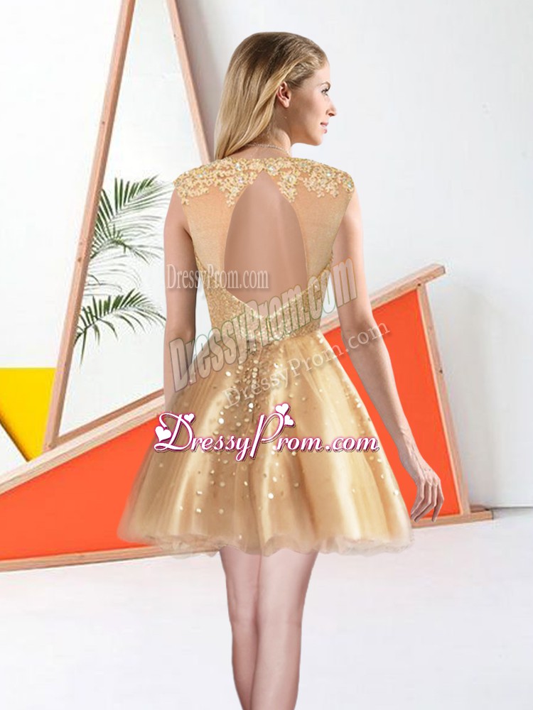 Neckline : ScoopShown Color : LavenderSilhouette : A-lineSleeve Length : sleevelessHemline : knee lengthBack Detail : BacklessFabric : OrganzaEmbellishment : Beading,LaceOccasion : Prom,PartySeason : Spring,Summer,Fall