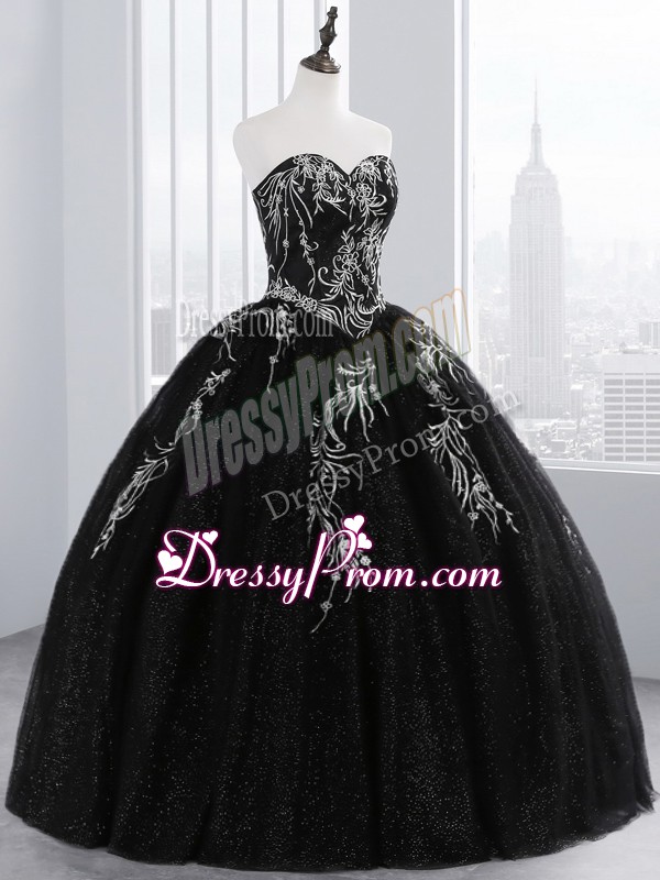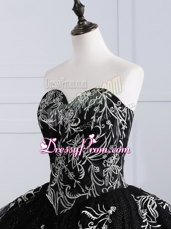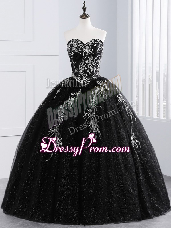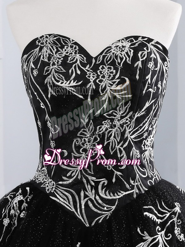 Neckline : SweetheartShown Color : BlackSilhouette : Ball GownsSleeve Length : sleevelessHemline : floor lengthBack Detail : Lace upFabric : TulleEmbellishment : EmbroideryOccasion : Military Ball,Sweet 16,QuinceaneraSeason : Spring,Summer,Fall,Winter