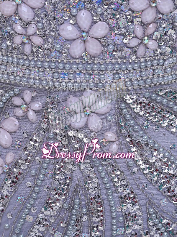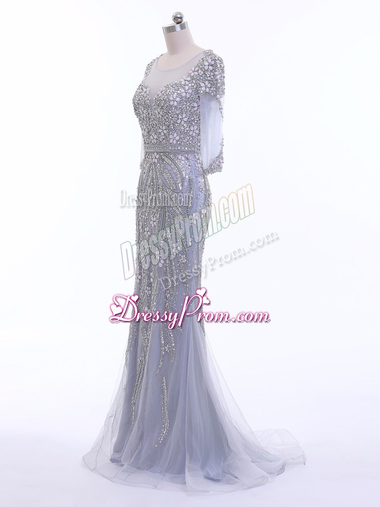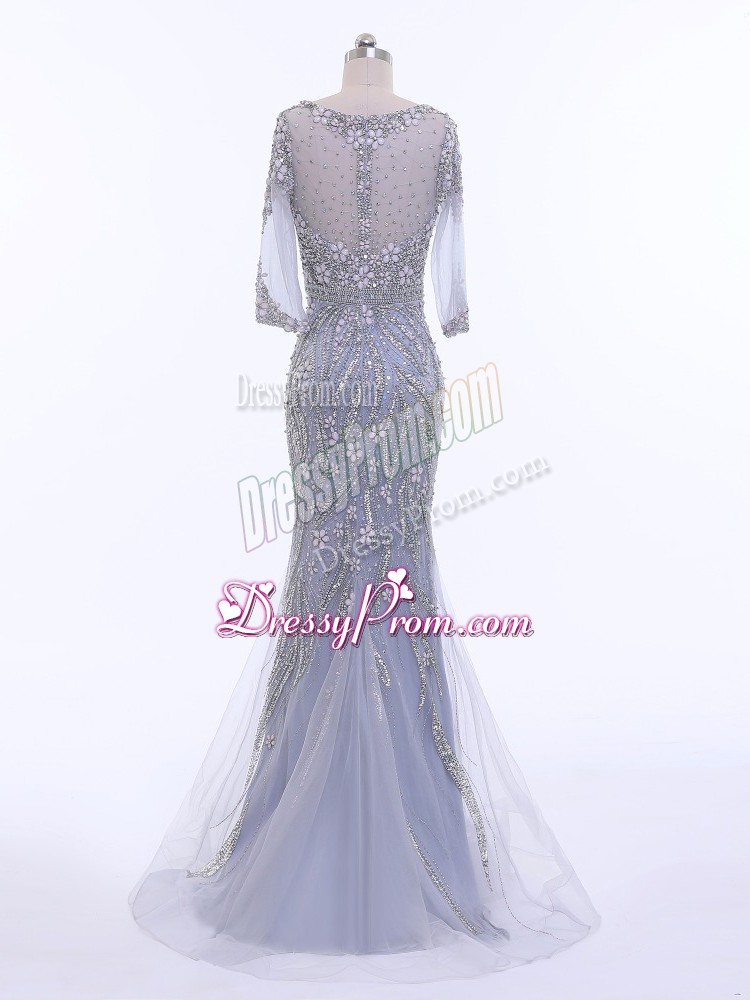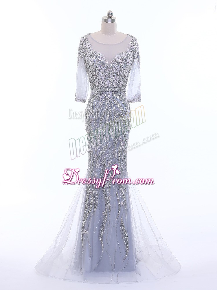 Neckline : ScoopShown Color : SilverSilhouette : Column/SheathSleeve Length : 3|4 length sleeveBack Detail : ZipperFabric : TulleEmbellishment : BeadingOccasion : Prom,Party,Military BallSeason : Spring,Summer,Fall,Winter