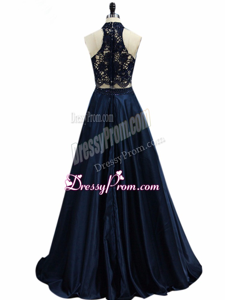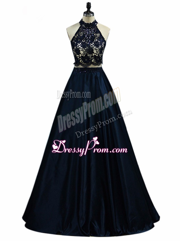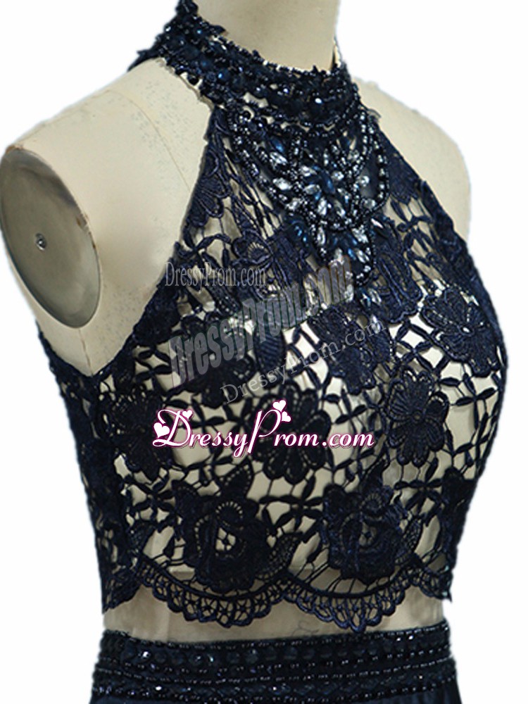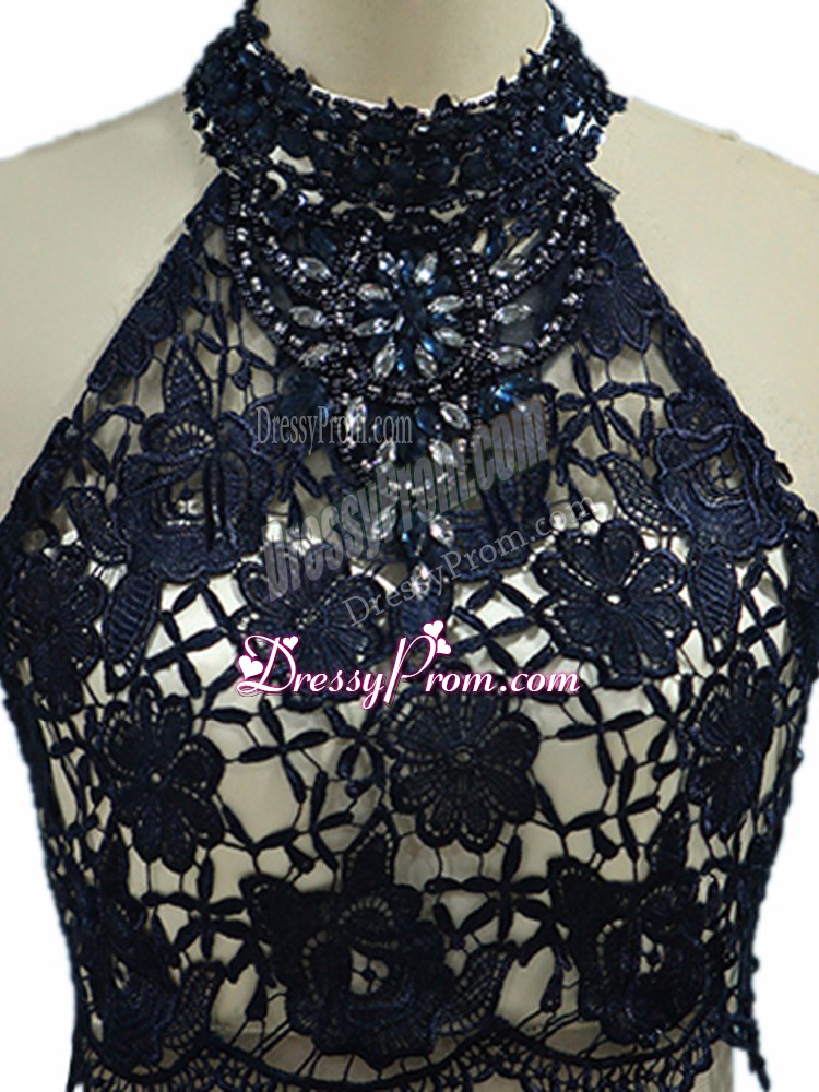 Neckline : Halter topShown Color : Navy BlueSilhouette : Two PiecesSleeve Length : sleevelessHemline : floor lengthBack Detail : ZipperFabric : TaffetaEmbellishment : Lace,AppliquesOccasion : Prom,Party,Military BallSeason : Spring,Summer,Fall,Winter