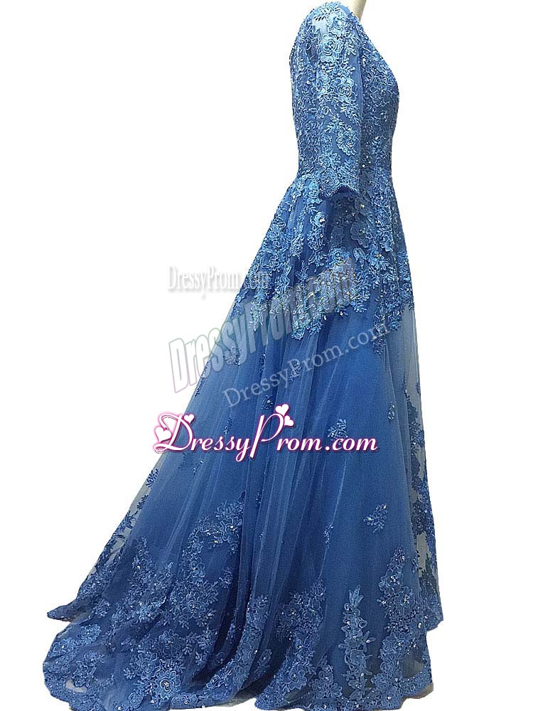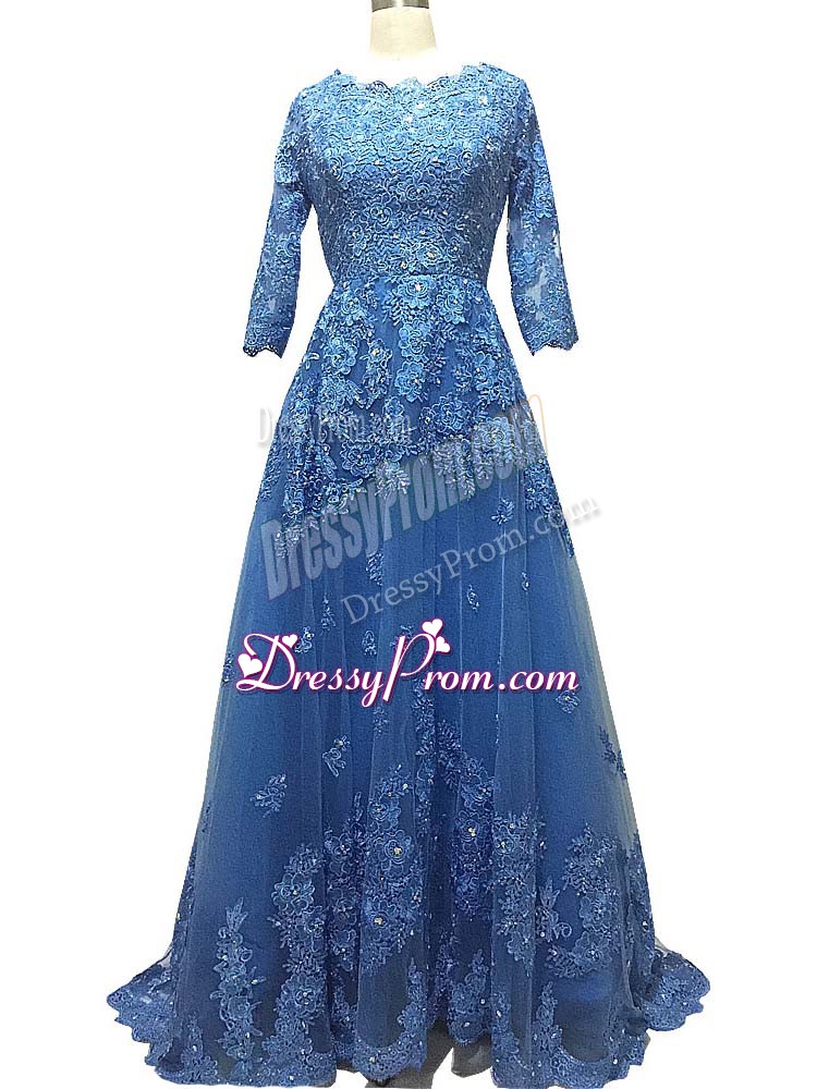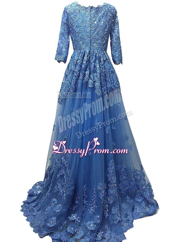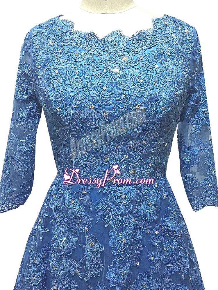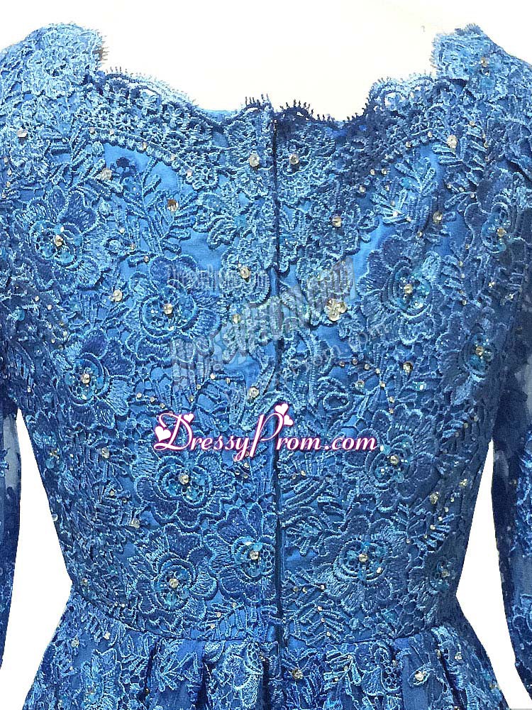 Neckline : ScallopedShown Color : BlueSilhouette : EmpireSleeve Length : 3|4 length sleeveBack Detail : ZipperFabric : TulleEmbellishment : Lace,AppliquesOccasion : Prom,PartySeason : Spring,Summer,Fall,Winter