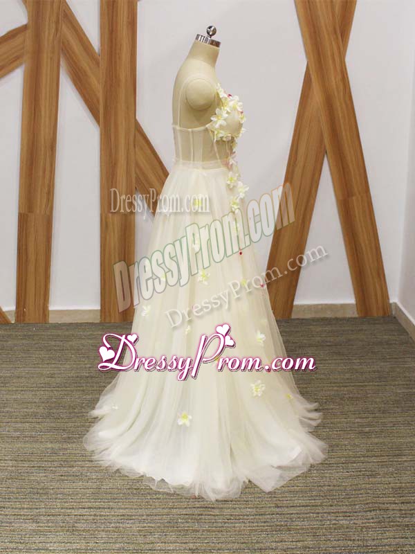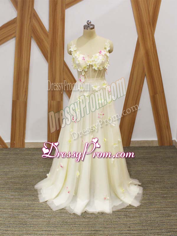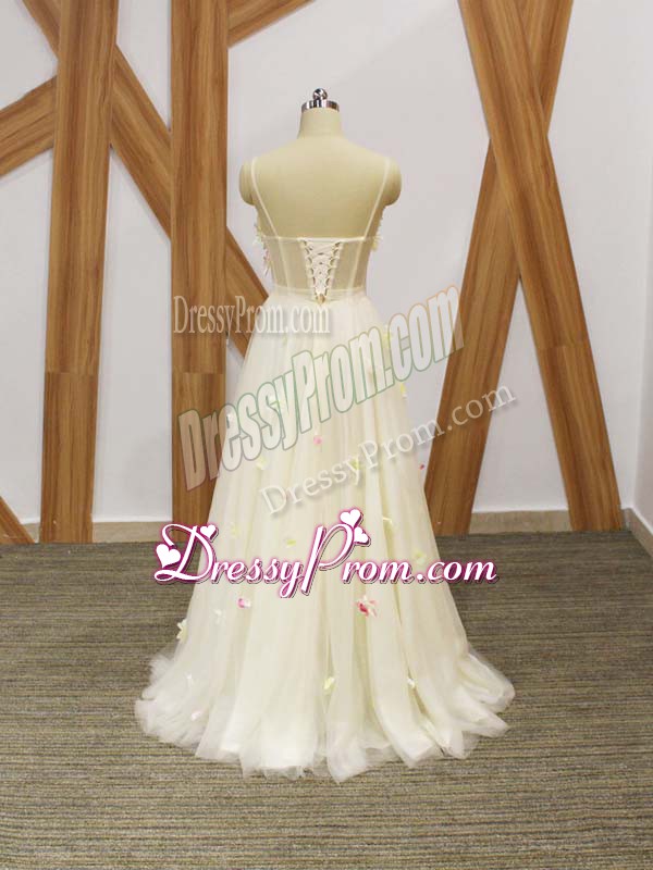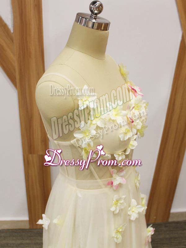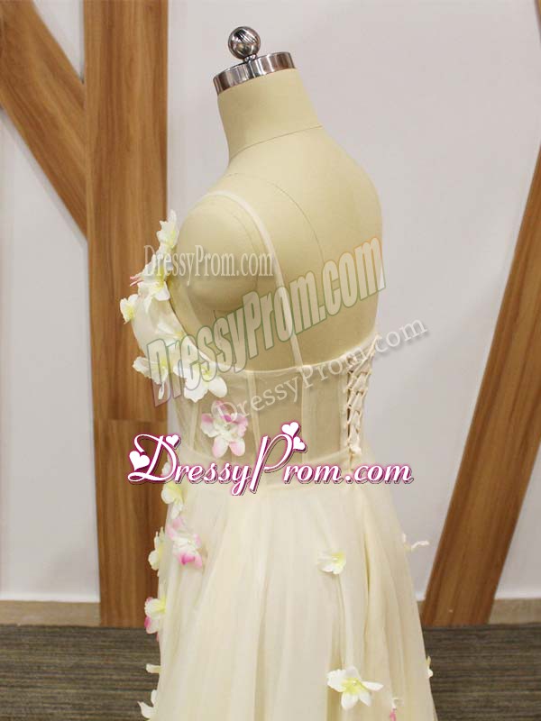Neckline : StrapsShown Color : ChampagneSilhouette : EmpireSleeve Length : sleevelessHemline : floor lengthBack Detail : Lace upFabric : TulleEmbellishment : Hand Made FlowerOccasion : Prom,Party,Sweet 16Season : Spring,Summer,Fall,Winter