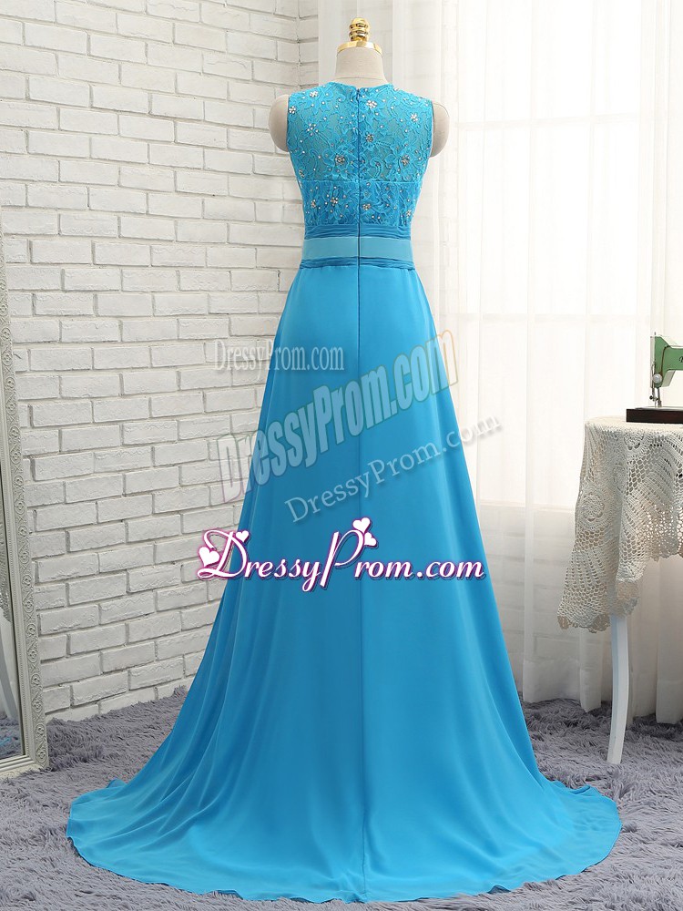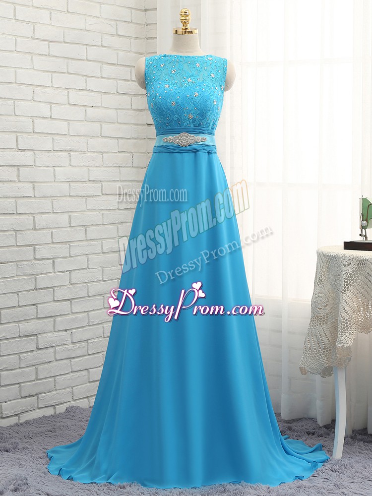 Neckline : BateauShown Color : Baby BlueSilhouette : EmpireSleeve Length : sleevelessBack Detail : ZipperFabric : ChiffonEmbellishment : Beading,LaceOccasion : Prom,PartySeason : Spring,Summer,Fall,Winter