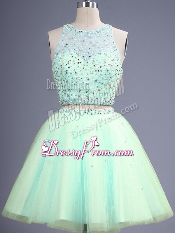 Neckline : Scoop Shown Color : Apple Green Silhouette : Two Pieces Sleeve Length : sleeveless Hemline : knee length Back Detail : Lace up Fabric : Tulle Embellishment : Beading Occasion : Prom,Party,Wedding Party Season : Spring,Summer,Fall