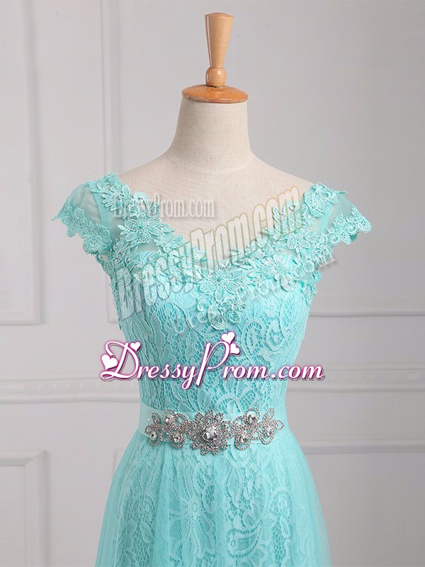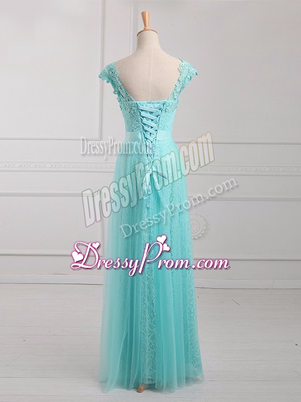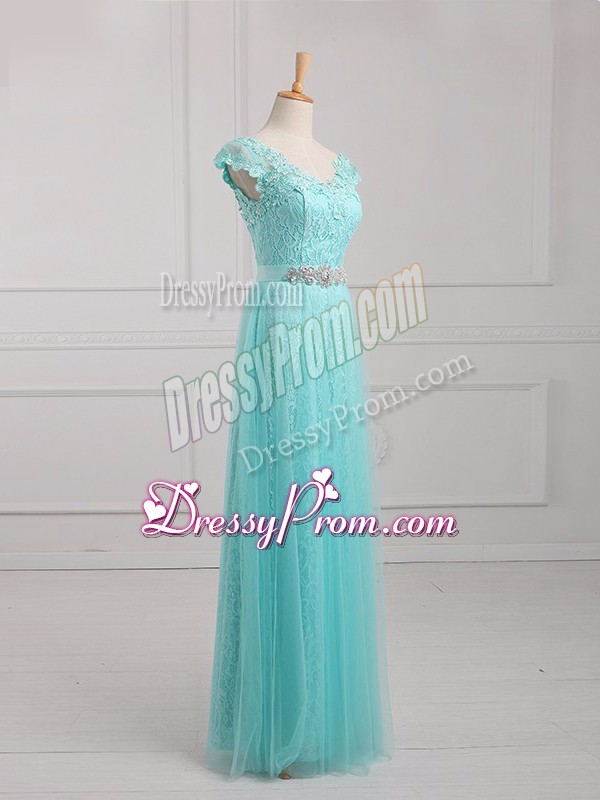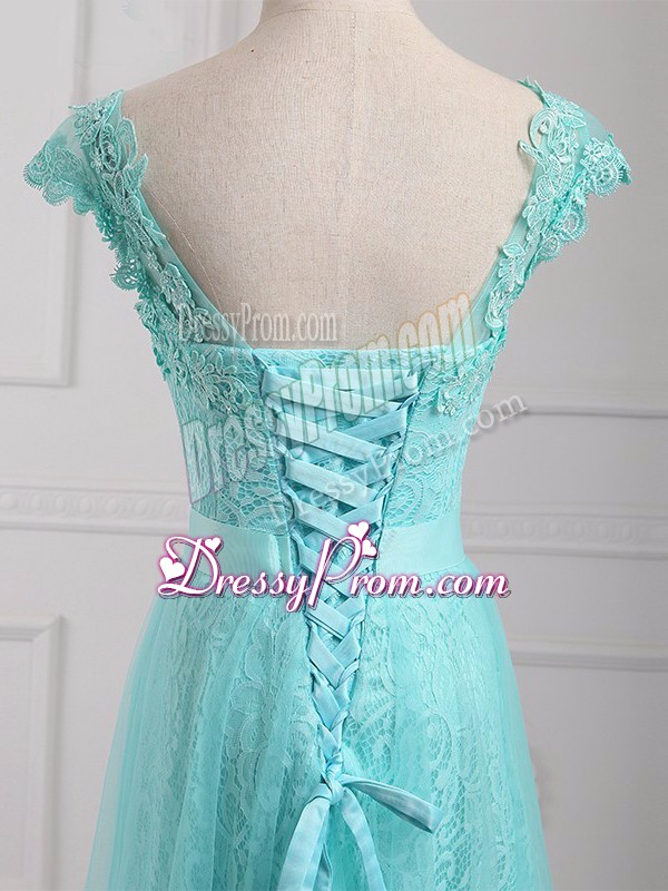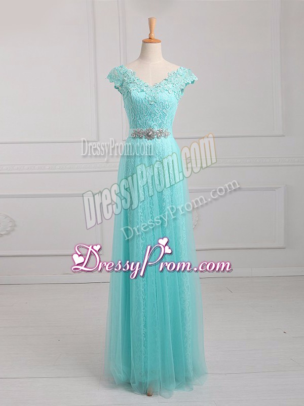 Neckline : V-neckShown Color : Aqua BlueSilhouette : EmpireSleeve Length : cap sleevesHemline : floor lengthBack Detail : Lace upFabric : Tulle,LaceEmbellishment : Beading,AppliquesOccasion : Prom,Party,Military BallSeason : Spring,Summer,Fall