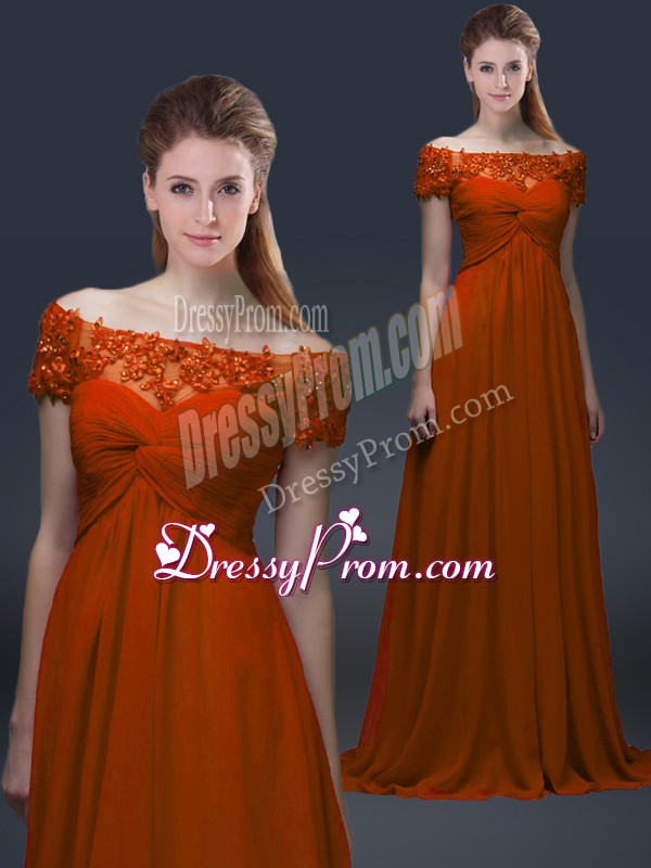 Latest Off The Shoulder Short Sleeves Prom Evening Gown Floor Length Appliques Rust Red Chiffon