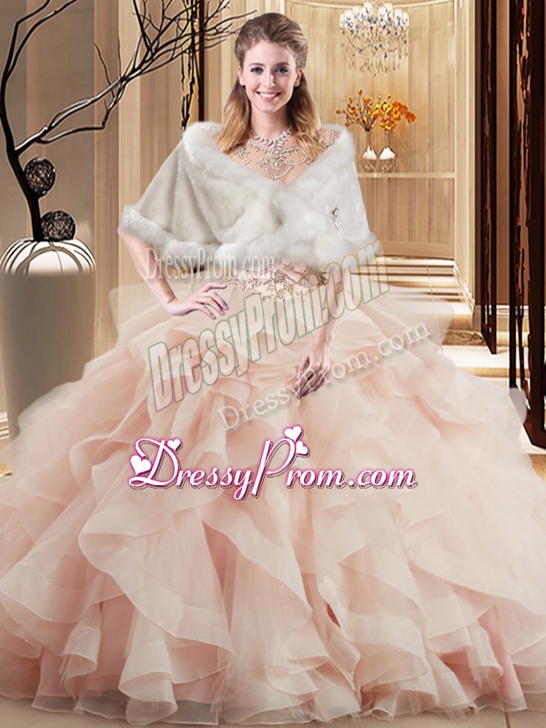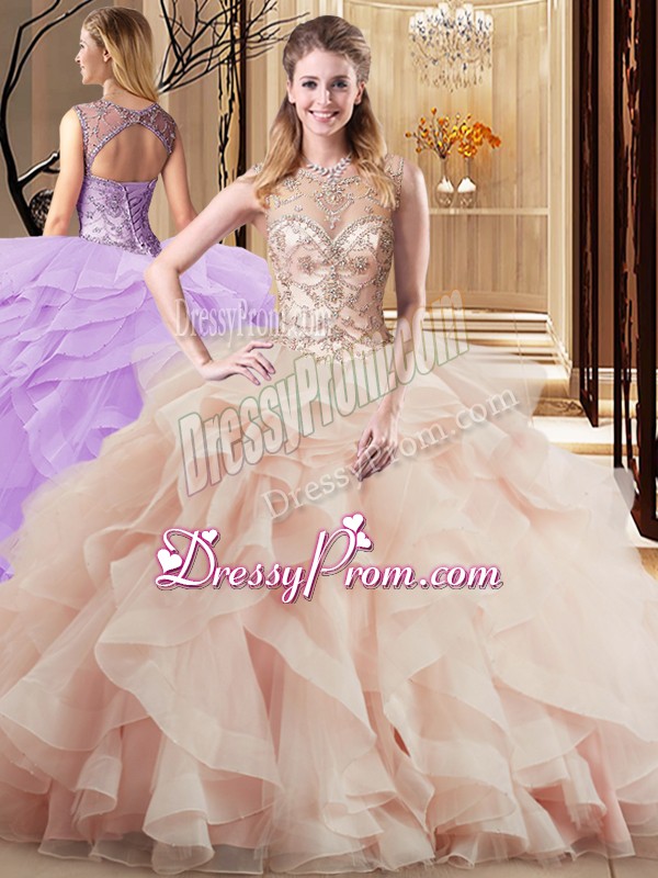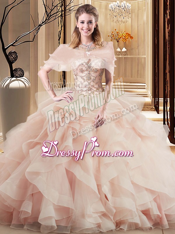 Neckline : ScoopShown Color : PeachSilhouette : Ball GownsSleeve Length : sleevelessBack Detail : Lace upFabric : TulleEmbellishment : Beading,RufflesOccasion : Military Ball,Sweet 16,QuinceaneraSeason : Spring,Summer,Fall,Winter