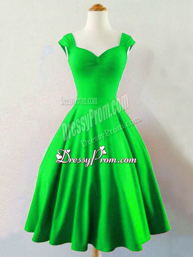 Neckline : StrapsShown Color : Spring GreenSilhouette : A-lineSleeve Length : sleevelessHemline : knee lengthBack Detail : Lace upFabric : TaffetaEmbellishment : RuchingOccasion : Prom,Party,Wedding PartySeason : Spring,Summer
