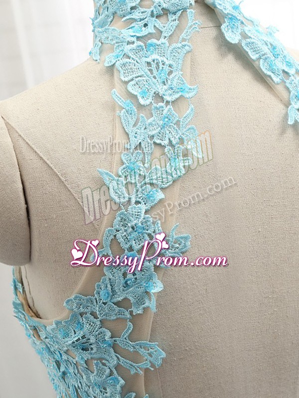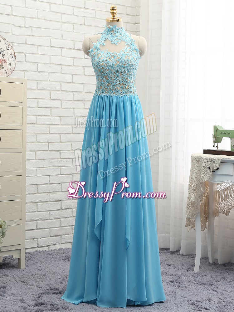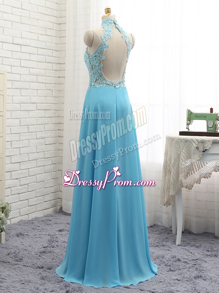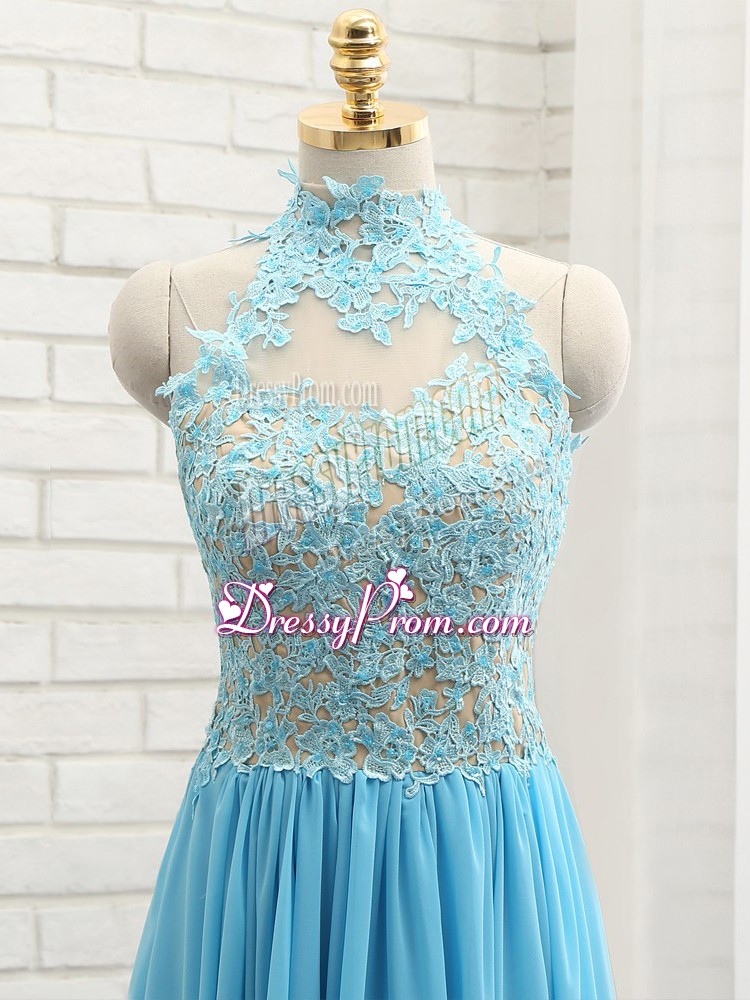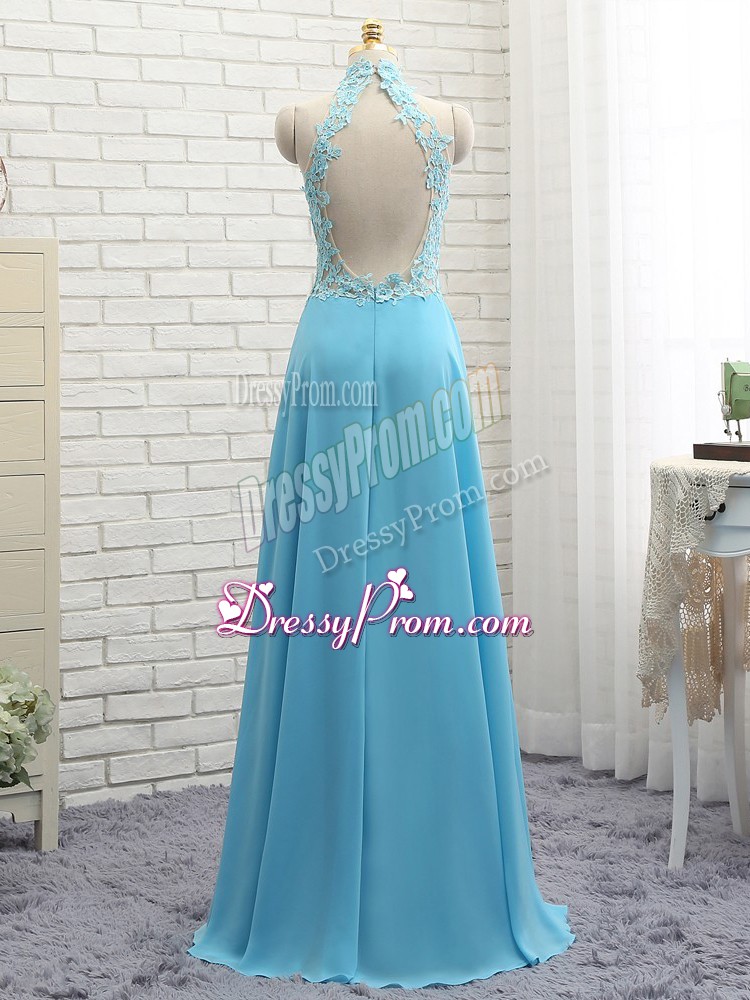 Neckline : Halter topShown Color : Baby BlueSilhouette : EmpireSleeve Length : sleevelessHemline : floor lengthBack Detail : BacklessFabric : ChiffonEmbellishment : LaceOccasion : Prom,PartySeason : Spring,Summer,Fall,Winter