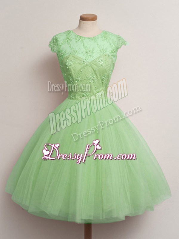 Neckline : Scoop Shown Color : Spring Green Silhouette : Ball Gowns Sleeve Length : cap sleeves Hemline : knee length Back Detail : Lace up Fabric : Tulle Embellishment : Lace Occasion : Prom,Party,Wedding Party Season : Spring,Summer,Fall