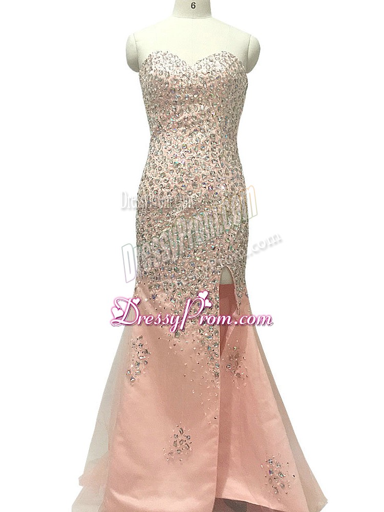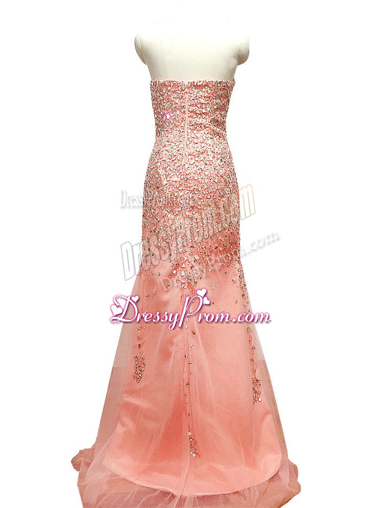 Neckline : SweetheartShown Color : PeachSilhouette : MermaidSleeve Length : sleevelessBack Detail : ZipperFabric : TulleEmbellishment : BeadingOccasion : Prom,Party,Military Ball,Sweet 16Season : Spring,Summer,Fall,Winter