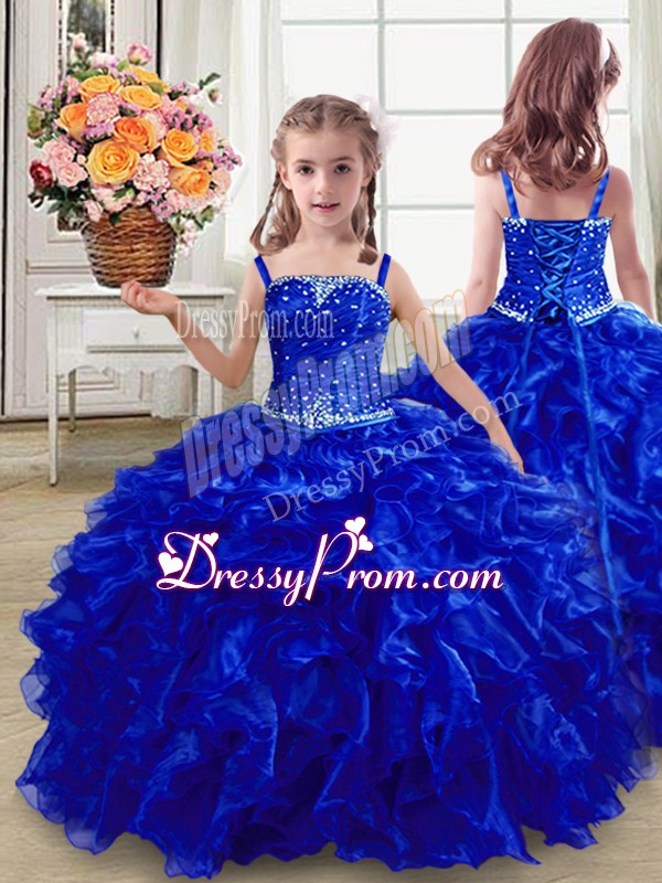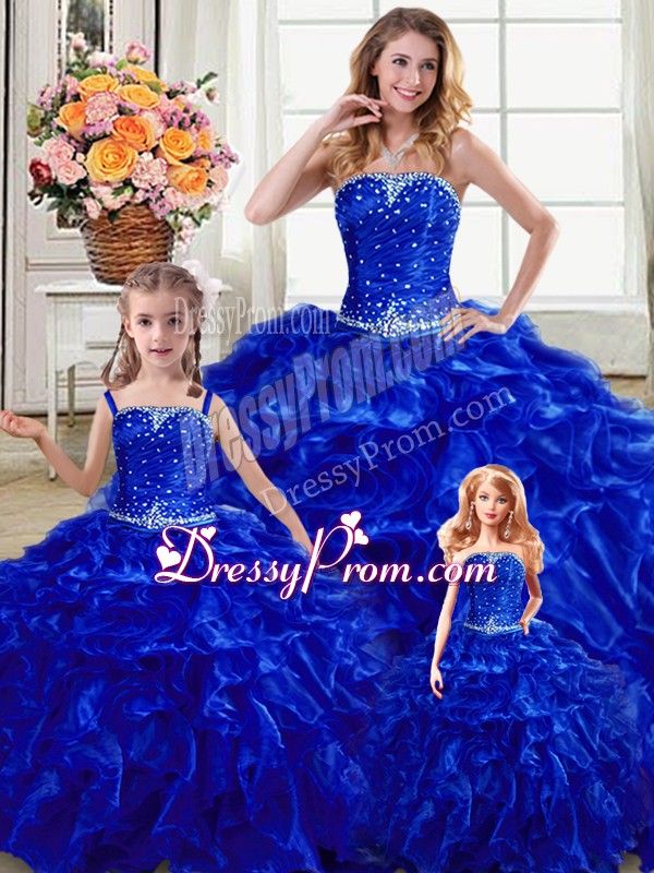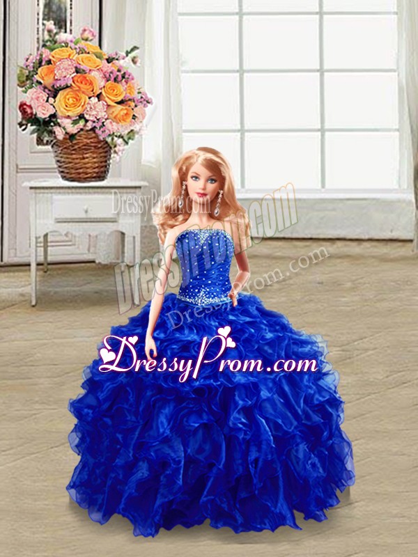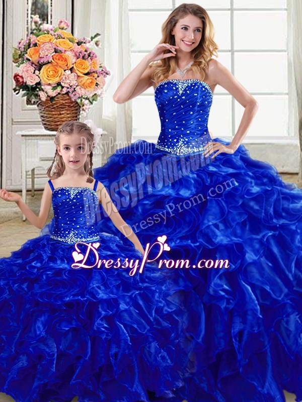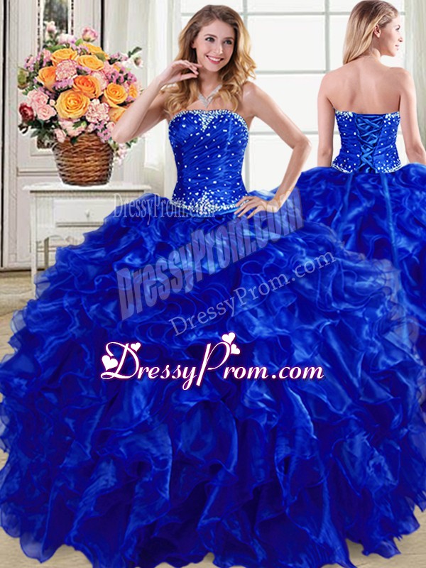 Neckline : StraplessShown Color : Royal BlueSilhouette : Ball GownsSleeve Length : sleevelessHemline : floor lengthBack Detail : Lace upFabric : OrganzaEmbellishment : Beading,RufflesOccasion : Military Ball,Sweet 16,QuinceaneraSeason : Spring,Summer,Fall,Winter