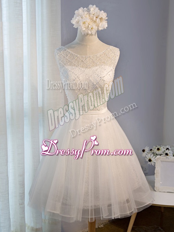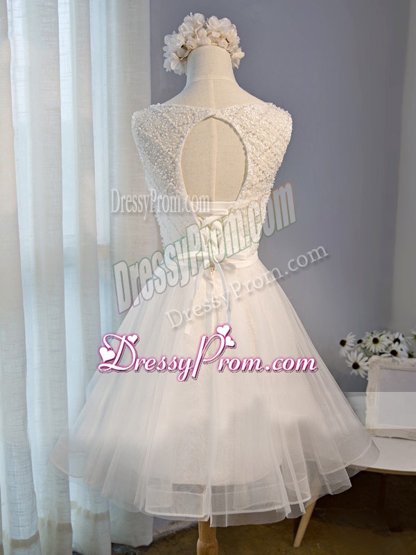 Neckline : ScoopShown Color : WhiteSilhouette : A-lineSleeve Length : sleevelessHemline : mini lengthBack Detail : Lace upFabric : TulleEmbellishment : BeadingOccasion : Prom,Party,Sweet 16Season : Spring,Summer,Fall