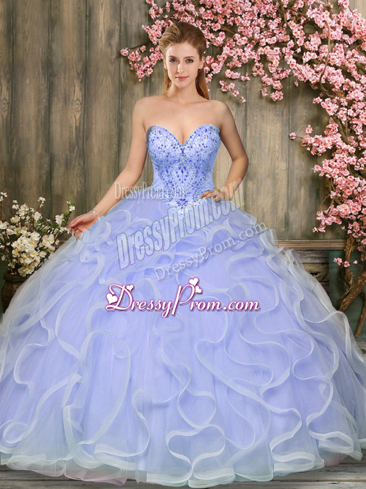 Neckline : SweetheartShown Color : LavenderSilhouette : Ball GownsSleeve Length : sleevelessHemline : floor lengthBack Detail : Lace upFabric : TulleEmbellishment : Beading,RufflesOccasion : Military Ball,Sweet 16,QuinceaneraSeason : Spring,Summer,Fall,Winter