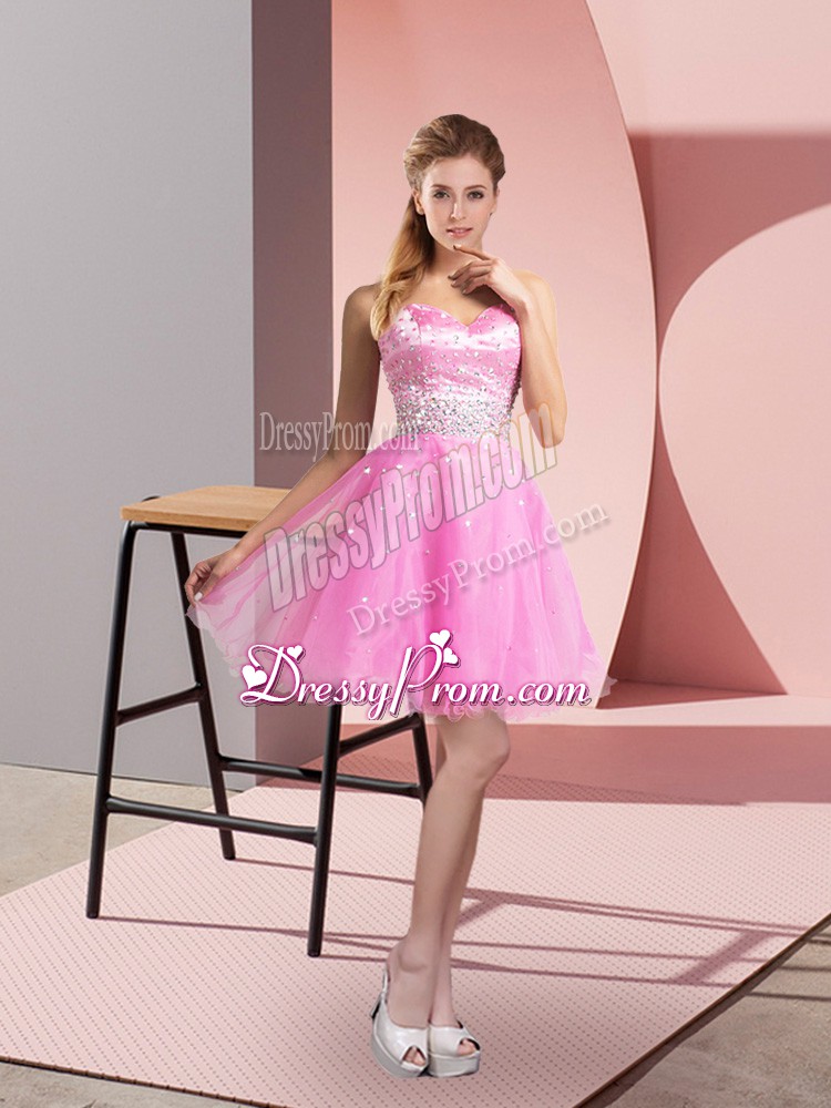 Neckline : SweetheartShown Color : Hot PinkSilhouette : A-lineSleeve Length : sleevelessHemline : mini lengthBack Detail : ZipperFabric : TulleEmbellishment : BeadingOccasion : Prom,Party,Sweet 16Season : Spring,Summer,Fall