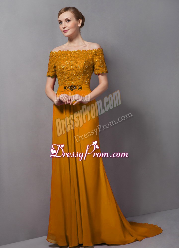 Neckline : Off the shoulderShown Color : GoldSilhouette : EmpireSleeve Length : short sleevesBack Detail : ZipperFabric : ChiffonEmbellishment : LaceOccasion : Prom,PartySeason : Spring,Summer,Fall,Winter