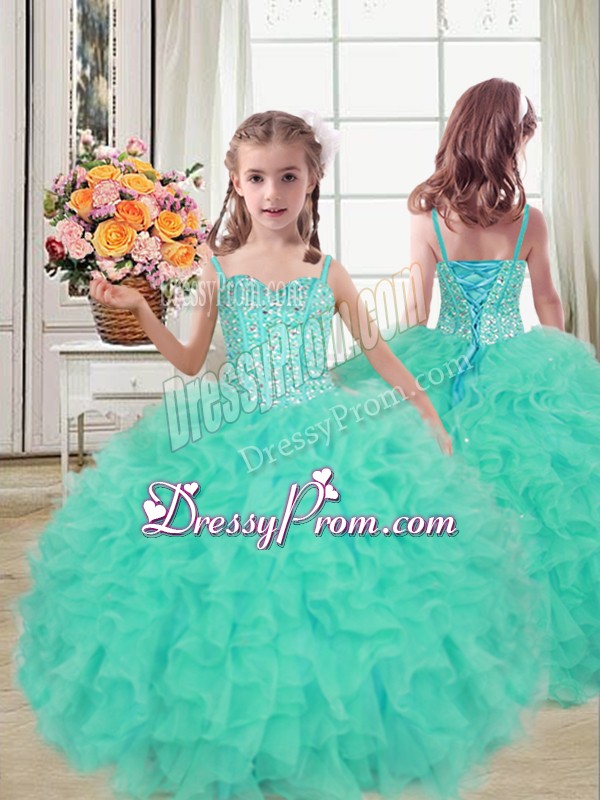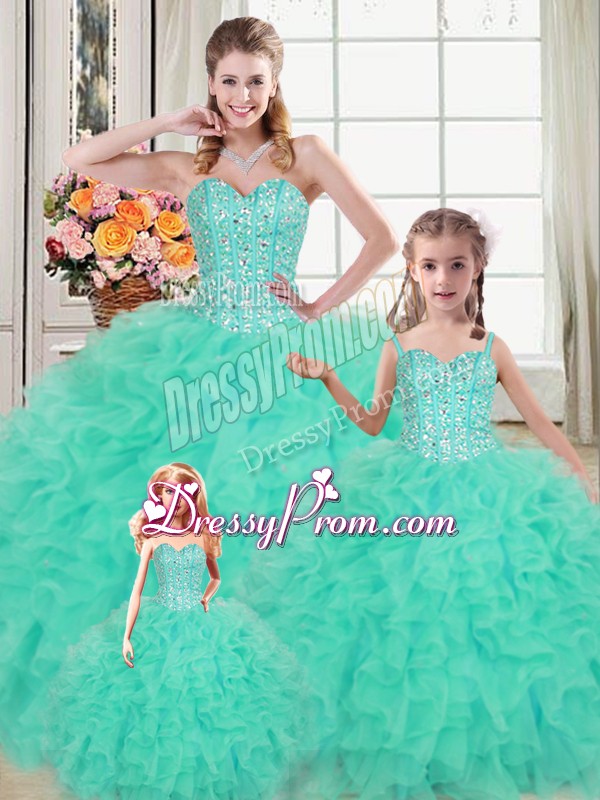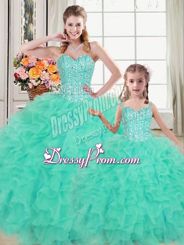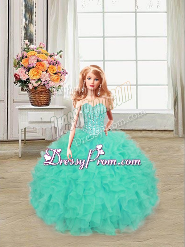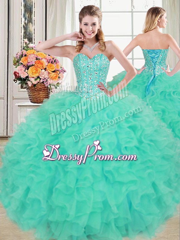 Neckline : SweetheartShown Color : TurquoiseSilhouette : Ball GownsSleeve Length : sleevelessHemline : floor lengthBack Detail : Lace upFabric : OrganzaEmbellishment : Beading,RufflesOccasion : Military Ball,Sweet 16,QuinceaneraSeason : Spring,Summer,Fall,Winter