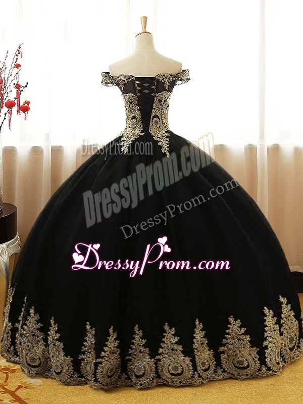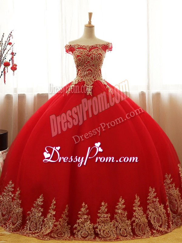Neckline : Off the shoulder Shown Color : Red Silhouette : Ball Gowns Sleeve Length : sleeveless Hemline : floor length Back Detail : Lace up Fabric : Tulle Embellishment : Appliques Occasion : Military Ball,Sweet 16,Quinceanera Season : Spring,Summer,Fall,Winter