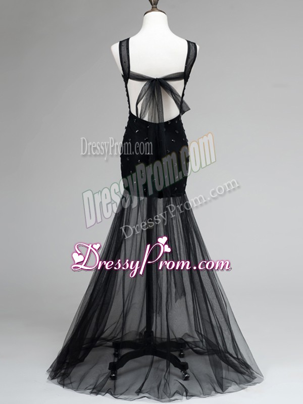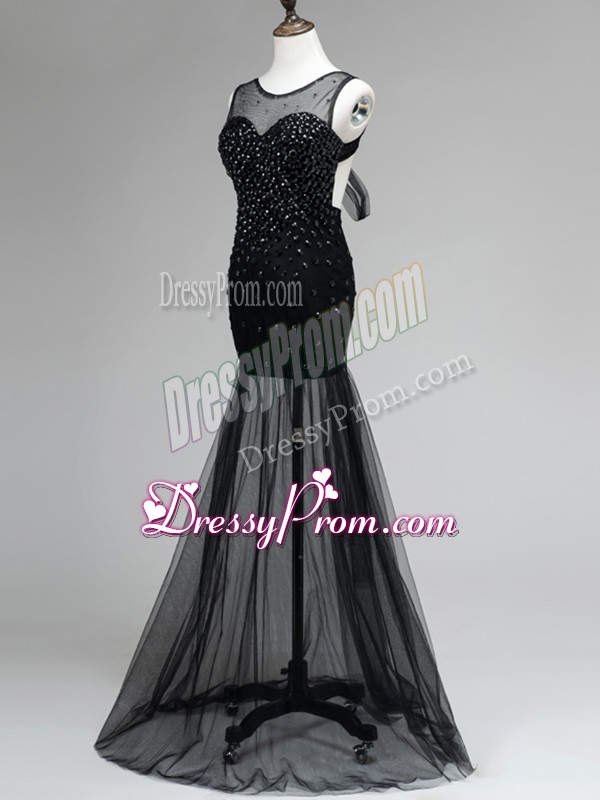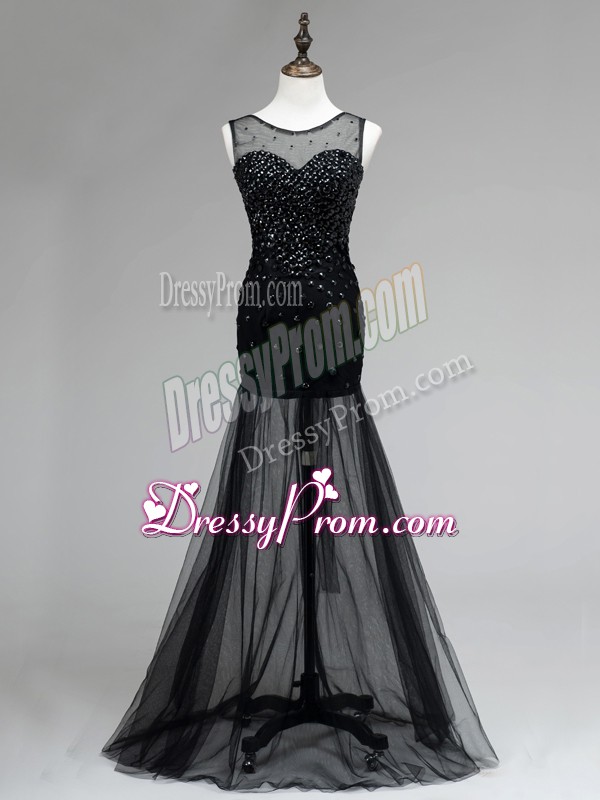 Neckline : ScoopShown Color : BlackSilhouette : EmpireSleeve Length : sleevelessHemline : floor lengthBack Detail : BacklessFabric : TulleEmbellishment : BeadingOccasion : Prom,Party,Military Ball,BeachSeason : Spring,Summer,Fall,Winter
