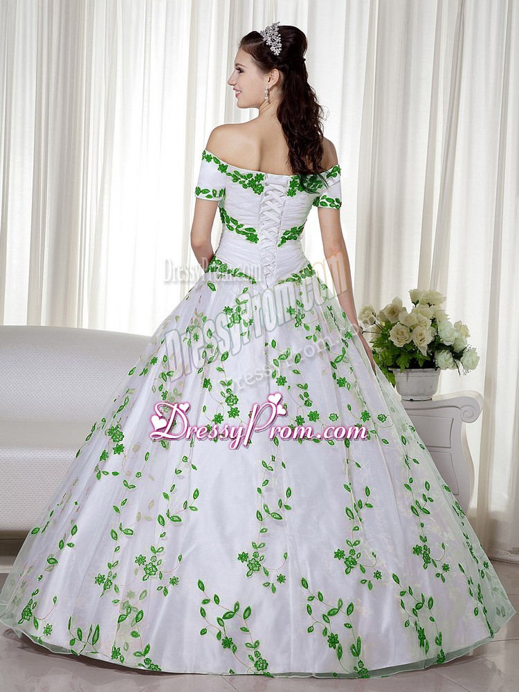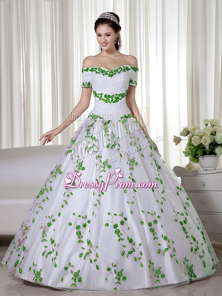 Neckline : Off the shoulder Shown Color : White Silhouette : Ball Gowns Sleeve Length : short sleeves Hemline : floor length Back Detail : Lace up Fabric : Organza Embellishment : Embroidery Occasion : Military Ball,Sweet 16,Quinceanera Season : Spring,Summer,Fall,Winter