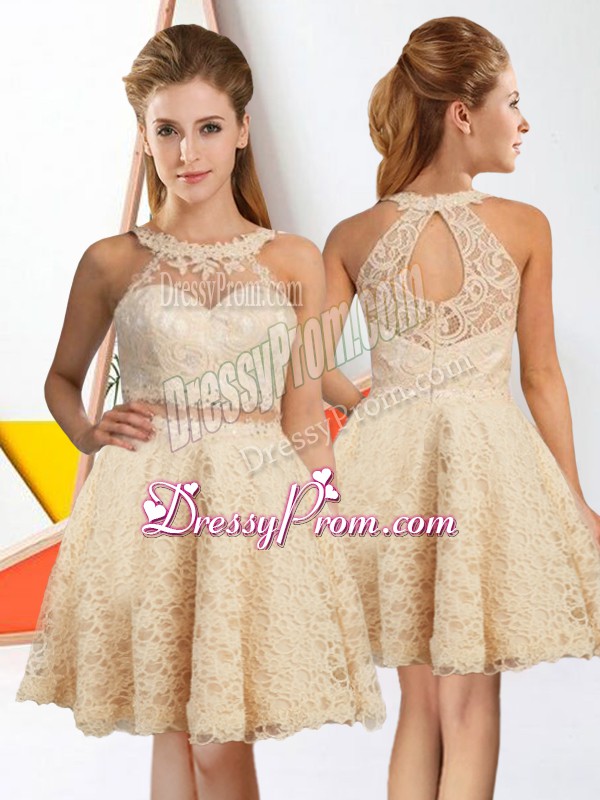 Neckline : Halter topShown Color : ChampagneSilhouette : A-lineSleeve Length : sleevelessHemline : knee lengthBack Detail : ZipperFabric : LaceEmbellishment : LaceOccasion : Prom,PartySeason : Spring,Summer,Fall