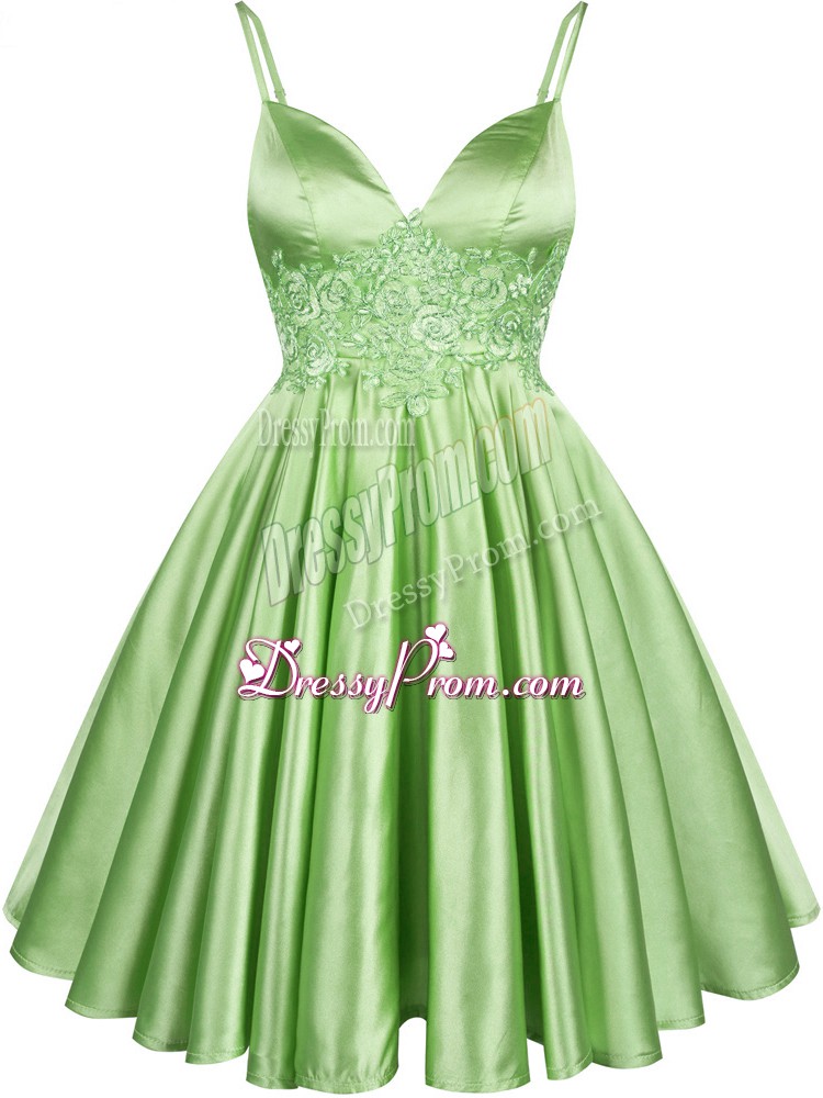 Neckline : Spaghetti strapsShown Color : GreenSilhouette : A-lineSleeve Length : sleevelessHemline : knee lengthBack Detail : Lace upFabric : Elastic Woven SatinEmbellishment : LaceOccasion : Prom,Party,Wedding PartySeason : Spring,Summer,Fall