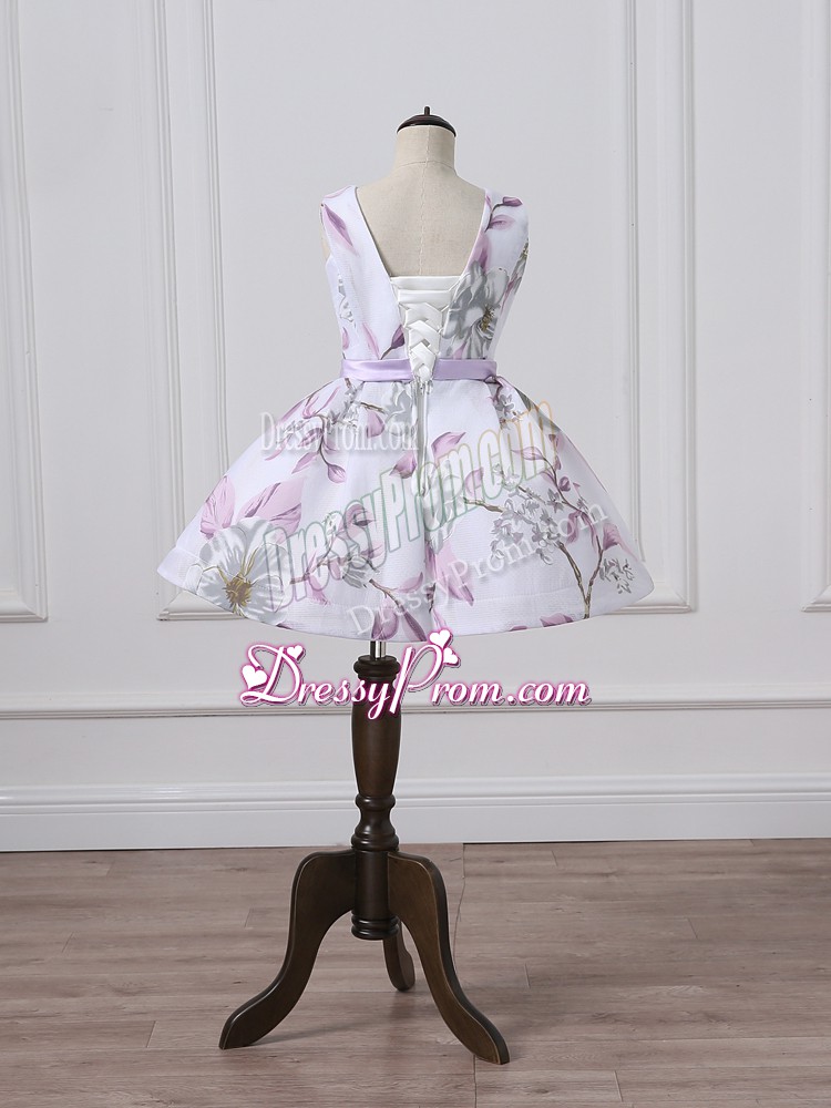 Neckline : ScoopShown Color : Multi-colorSilhouette : A-lineSleeve Length : sleevelessHemline : mini lengthBack Detail : Lace upFabric : PrintedEmbellishment : BeltOccasion : Prom,Party,BeachSeason : Spring,Summer,Fall