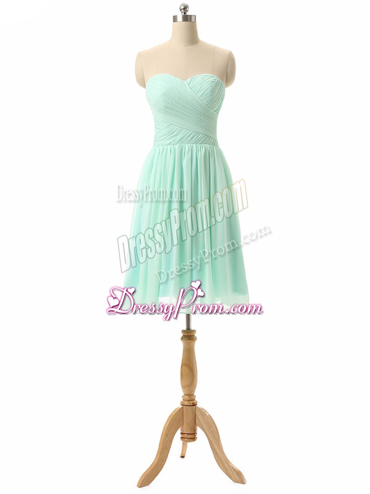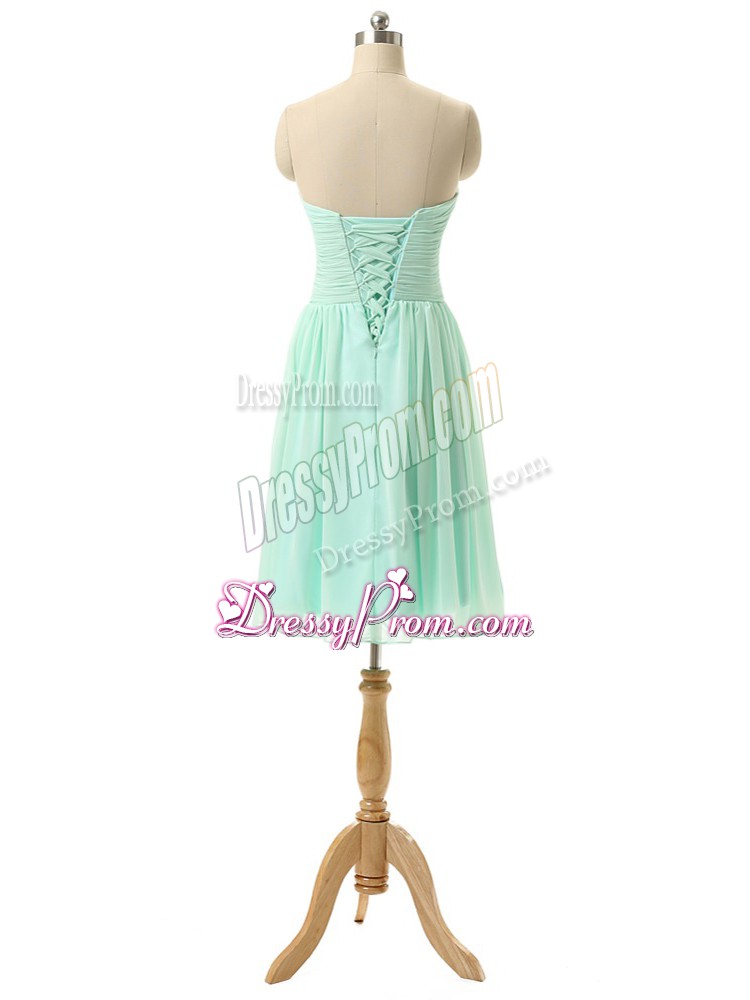 Neckline : SweetheartShown Color : Apple GreenSilhouette : EmpireSleeve Length : sleevelessHemline : knee lengthBack Detail : Lace upFabric : ChiffonEmbellishment : RuchingOccasion : Prom,Party,Wedding PartySeason : Spring,Summer,Fall
