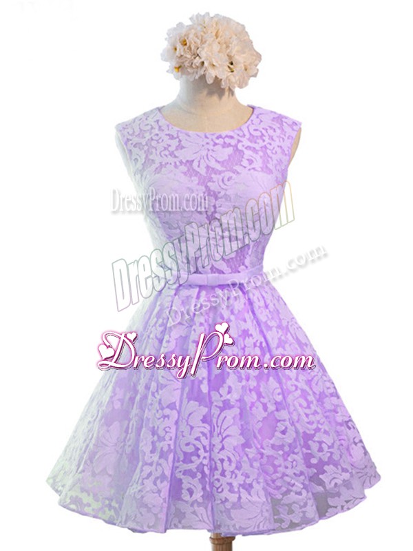 Neckline : ScoopShown Color : LavenderSilhouette : A-lineSleeve Length : sleevelessHemline : knee lengthBack Detail : Lace upFabric : LaceEmbellishment : BeltOccasion : Prom,Party,Wedding PartySeason : Spring,Summer,Fall