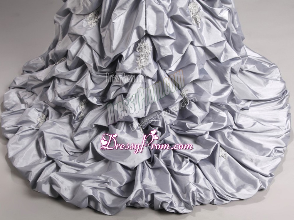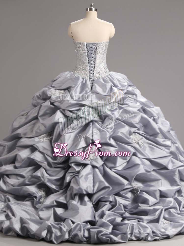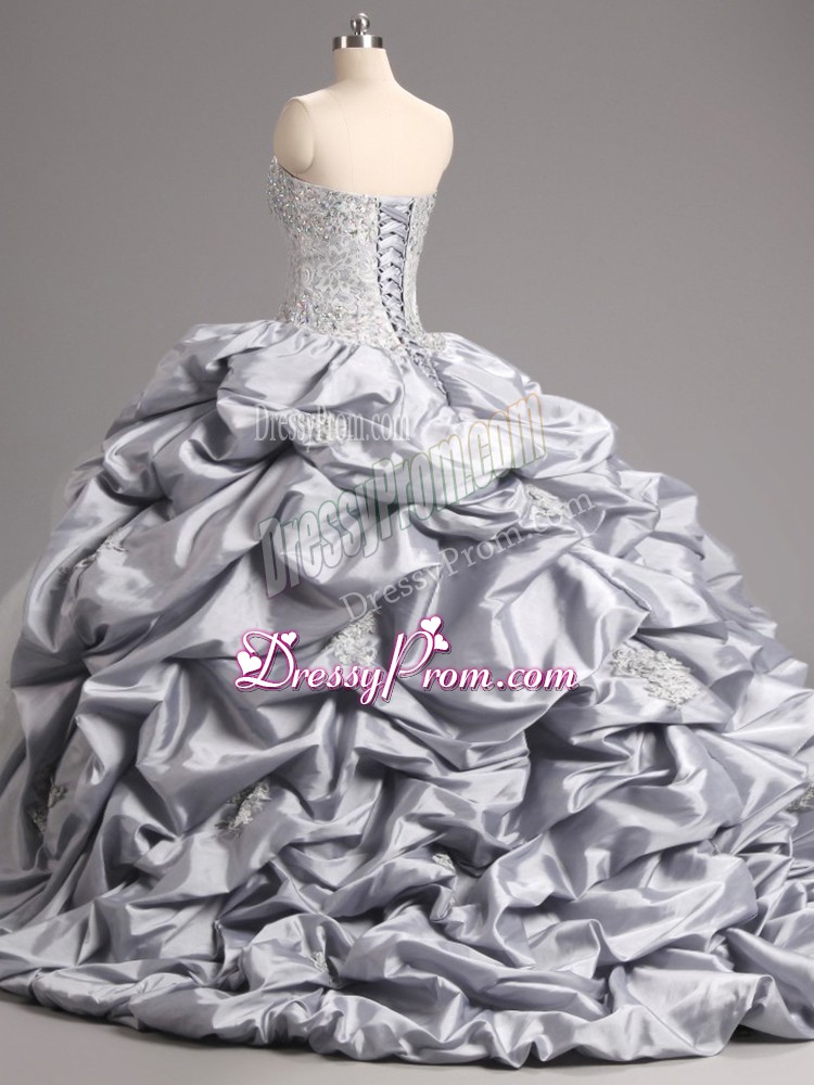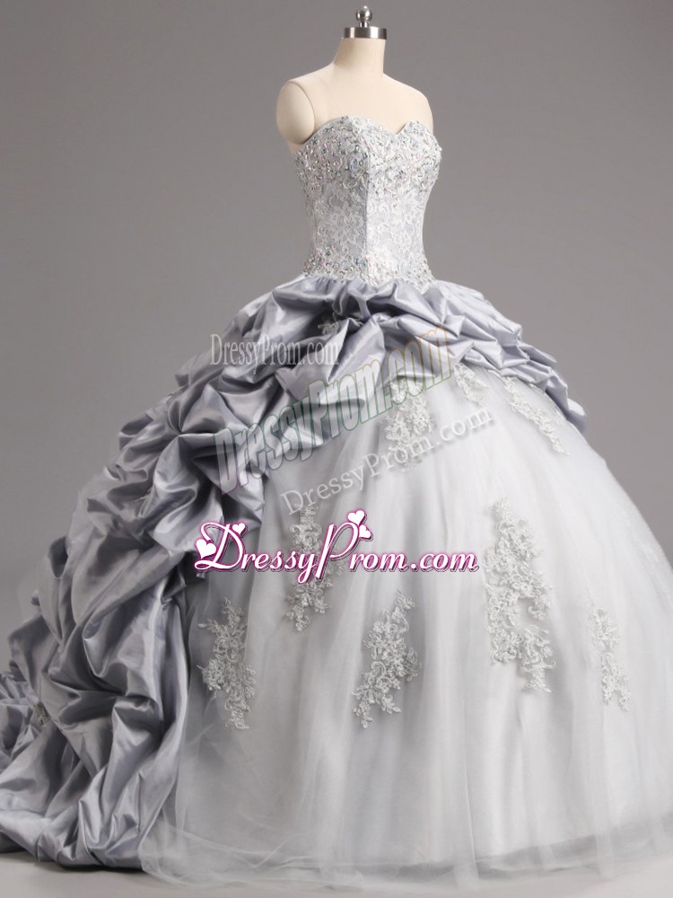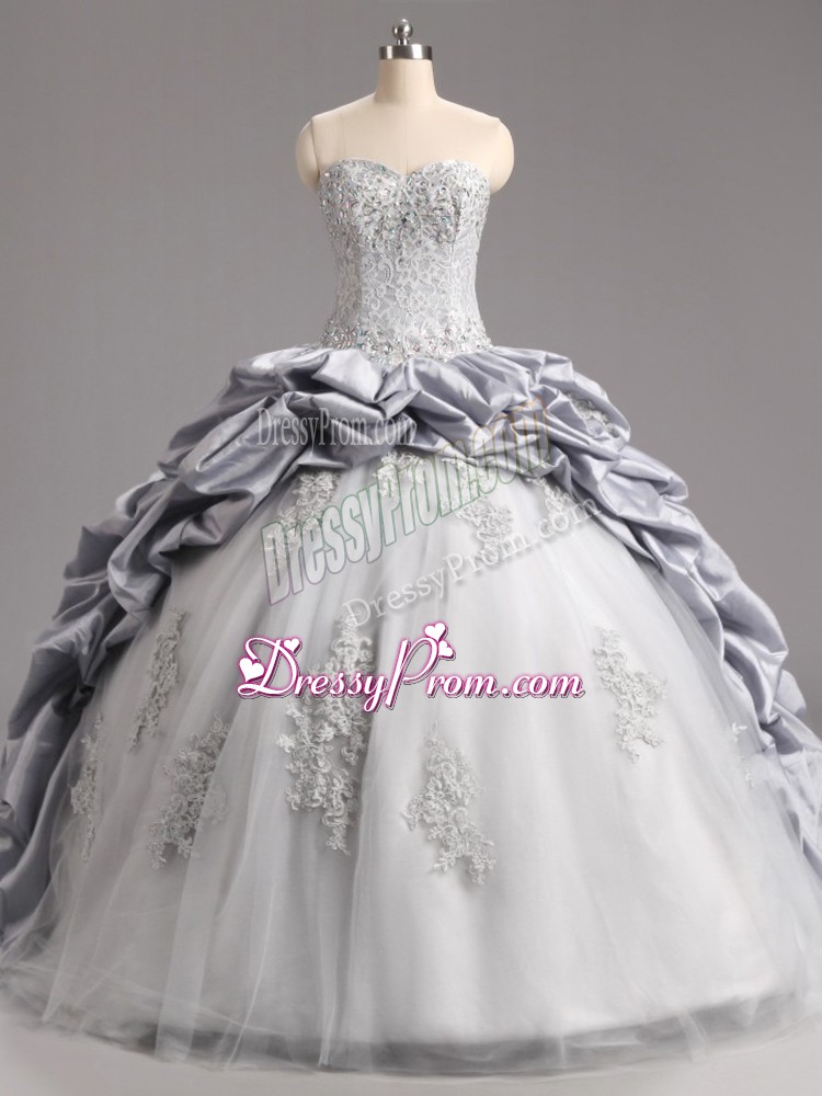 Neckline : SweetheartShown Color : SilverSilhouette : Ball GownsSleeve Length : sleevelessBack Detail : Lace upFabric : Taffeta,TulleEmbellishment : Beading,Appliques,Pick UpsOccasion : Military Ball,Sweet 16,QuinceaneraSeason : Spring,Summer,Fall,Winter