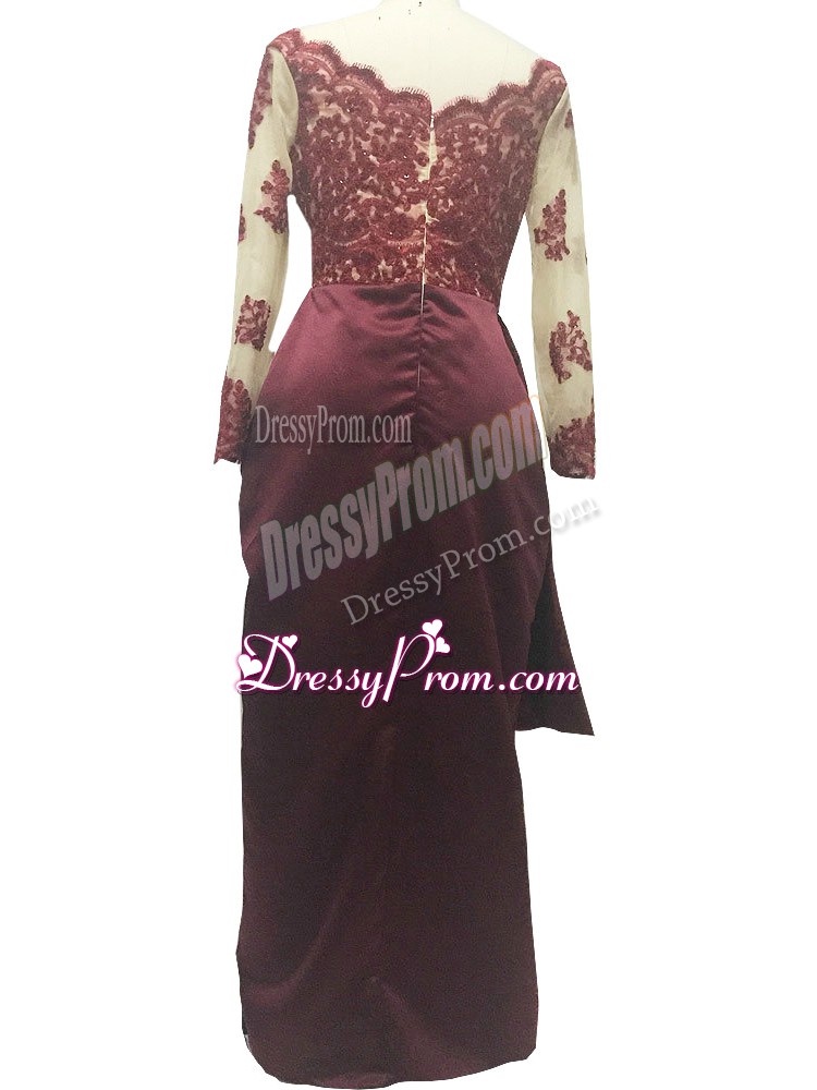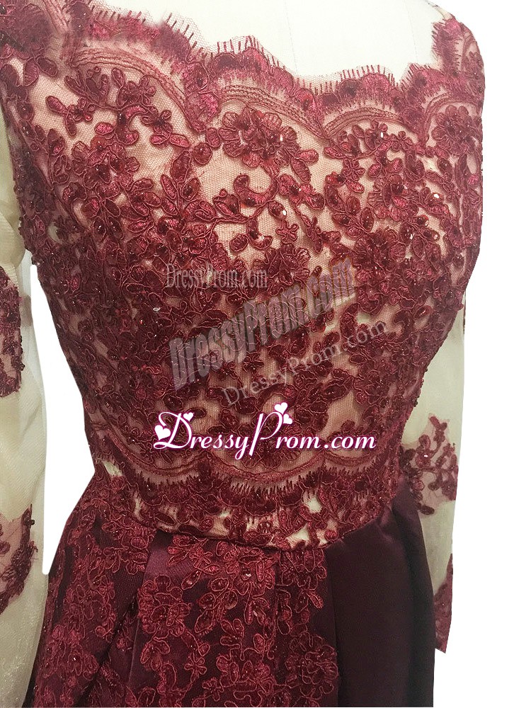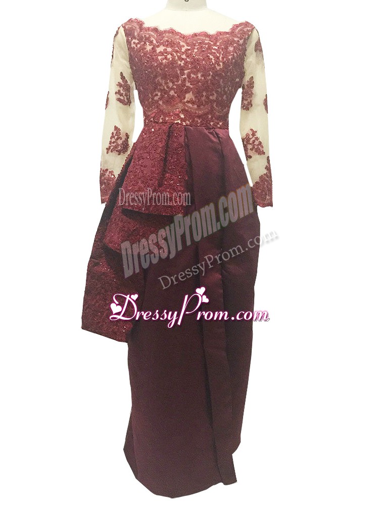 Neckline : ScallopedShown Color : BurgundySilhouette : Column/SheathSleeve Length : long sleevesHemline : floor lengthBack Detail : ZipperFabric : TaffetaEmbellishment : Lace,AppliquesOccasion : Prom,Party,Military Ball,BeachSeason : Spring,Summer,Fall,Winter