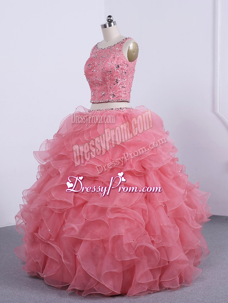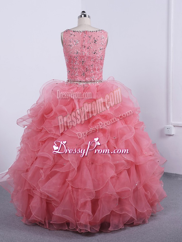 Neckline : ScoopShown Color : Watermelon RedSilhouette : Two PiecesSleeve Length : sleevelessHemline : floor lengthBack Detail : ZipperFabric : OrganzaEmbellishment : Beading,RufflesOccasion : Military Ball,Sweet 16,QuinceaneraSeason : Spring,Summer,Fall,Winter