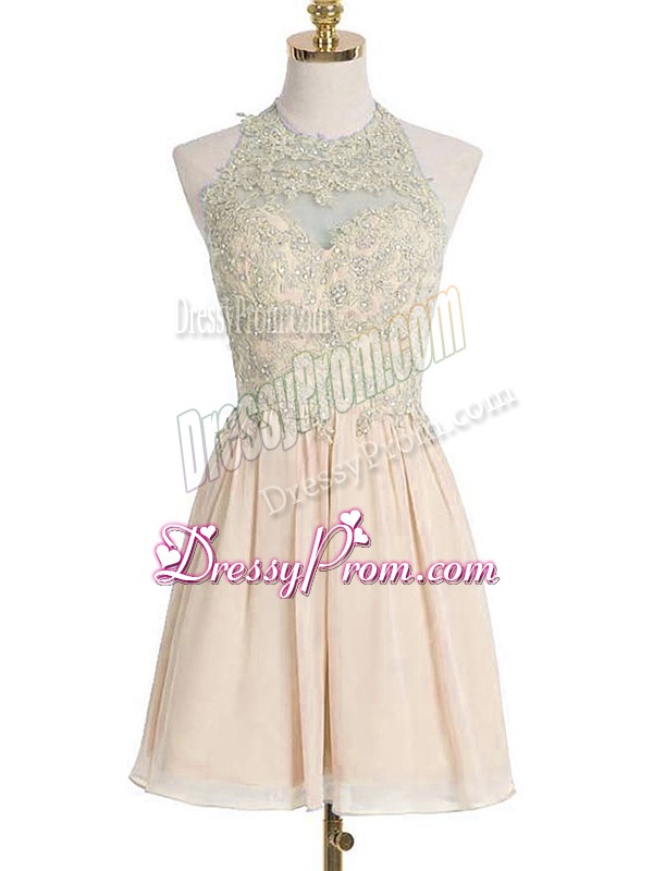 Neckline : Halter topShown Color : ChampagneSilhouette : EmpireSleeve Length : sleevelessHemline : knee lengthBack Detail : Lace upFabric : ChiffonEmbellishment : AppliquesOccasion : Prom,Party,Wedding PartySeason : Spring,Summer,Fall