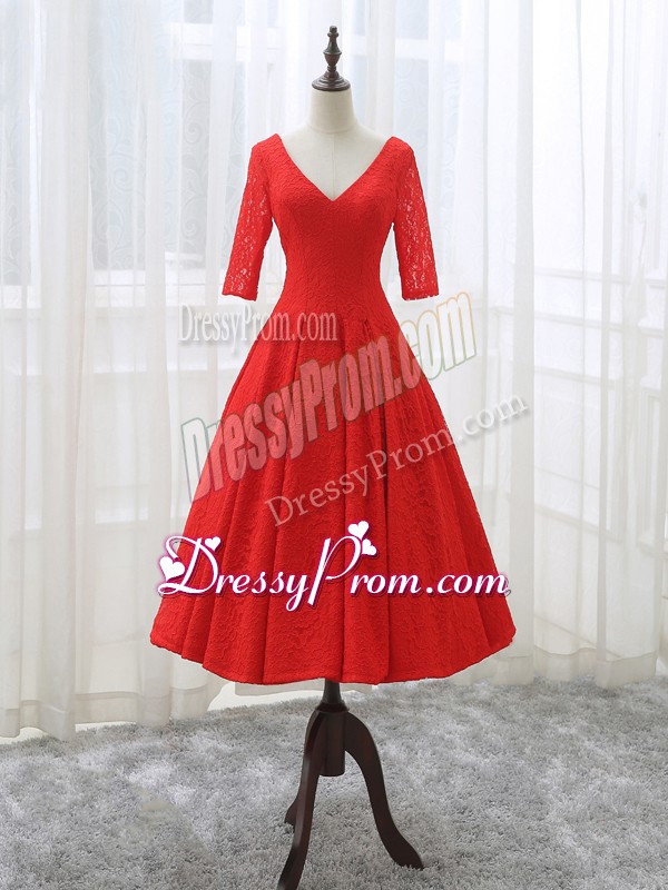 Neckline : V-neckShown Color : RedSilhouette : A-lineSleeve Length : half sleevesHemline : tea lengthBack Detail : Lace upFabric : LaceEmbellishment : Lace,AppliquesOccasion : Prom,Party,Sweet 16Season : Spring,Summer,Fall