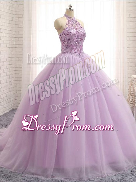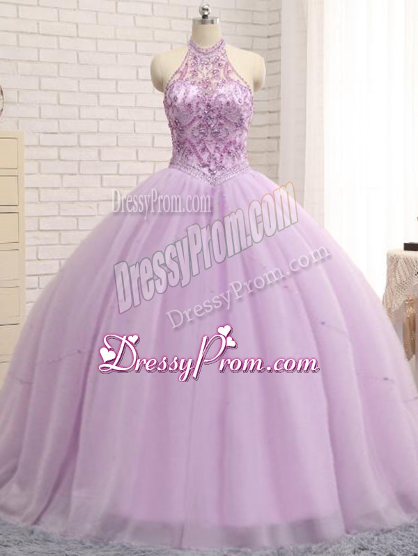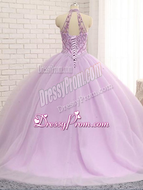 Neckline : Halter topShown Color : LilacSilhouette : Ball GownsSleeve Length : sleevelessBack Detail : Lace upFabric : TulleEmbellishment : BeadingOccasion : Military Ball,Sweet 16,QuinceaneraSeason : Spring,Summer,Fall,Winter