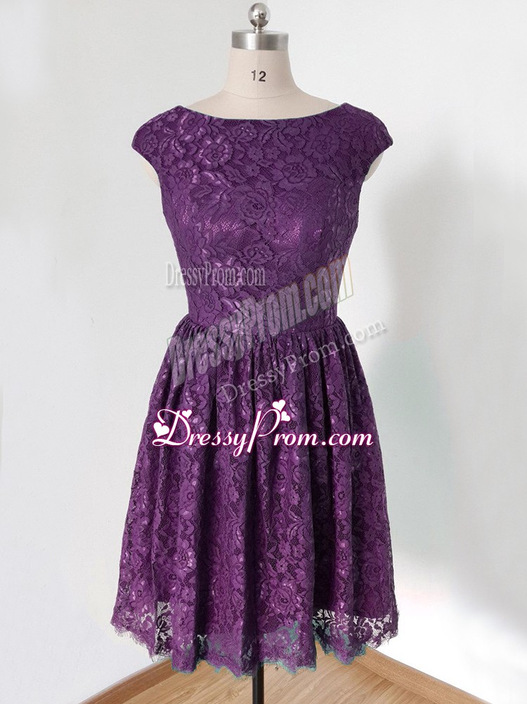 Neckline : ScoopShown Color : Dark PurpleSilhouette : EmpireSleeve Length : sleevelessHemline : knee lengthBack Detail : Lace upFabric : LaceEmbellishment : LaceOccasion : Prom,Party,Wedding PartySeason : Spring,Summer,Fall